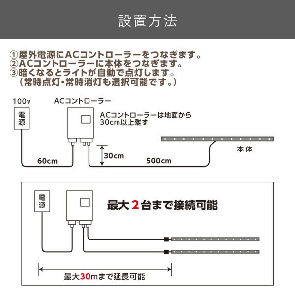| 商品説明 | ●ガーデントワイライトの追加用単品販売のページです ●スタートキットに追加してライトアップの幅を広げれます ●IP65の防塵防水性能なので雨天でも問題なく使用できます ●屋外用PSE認証を取得済みなのでお庭でも安全にお使い頂けます ●お庭の電源に接続するだけで誰でも簡単にライトアップが楽しめます ●ライトは耐久性の高いアルミ素材 ●LED寿命が50,000時間なので長期間交換が不要です ●ACコントローラーで夜間に自動ライトアップが可能 ●自動点灯や消灯、タイマー消灯等のパターン切り替えが可能です ●LEDタイプ:SMD LED×12 ●LED寿命:50,000時間 ※1日11時間点灯で約12年間使用可能です LED電球を交換することはできません ●消費電力:12W ●電気代1年間で約2020円 ※1台追加毎に年間+約1800円 ※1kwh=31円換算、1日当たり11時間点灯 ●コードの長さ:5m ●屋外用PSE認証取得済み ●セット内容:ガーデンライトロングライン×1のみ ※ACコントローラーは付属しておりません。初めてのご購入の場合は別売のACコントローラーが必要となります。 |