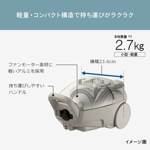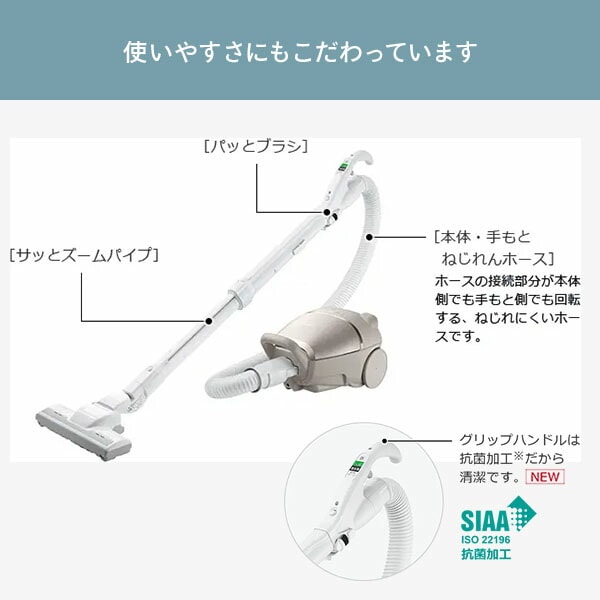 | 商品説明 | ●強い吸引力で軽々キレイにできる紙パック式クリーナー ●軽量・コンパクト構造で持ち運びラクラク ●高性能ファンモーター搭載 ●強烈パワー620W(消費電力1,180W) ●「ごみハンターヘッド」で軽い力で前進 ●「サッとズームパイプ」でパイプの長さを簡単調節 ●「パッとブラシ」で気になるところを手軽にお掃除 ●「クルッとヘッド」で壁ぎわや狭い場所もラクにお掃除 ●グリップハンドルは抗菌加工で清潔 ●紙パック式 ●運転音:66dB~約60dB ●集じん容積:1.3L ●コードの長さ:5m ●合計質量(本体/ホース/パイプ/ヘッド):4.4kg ●付属品:パッとブラシ、すき間用吸口、パックフィルターGP-110F×1枚 ※こちらの商品は2025年7月に仕様変更をしております ・型番:CV-KP90K(N)→CV-KP90L(N) ・消費電力:240~1170W→240~1180W ・騒音値:60~65dB→60~66dB ・抗菌:無し→有り(グリップハンドル) |