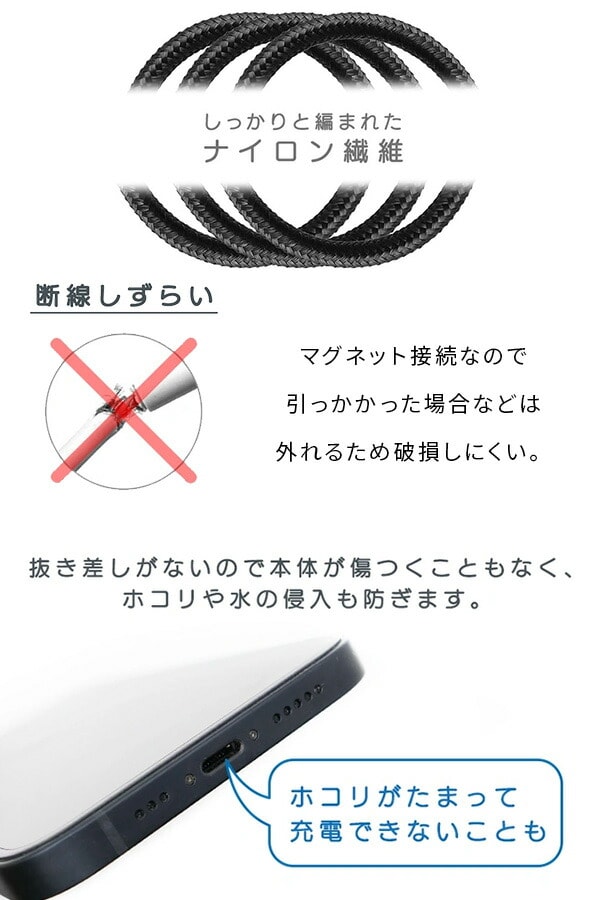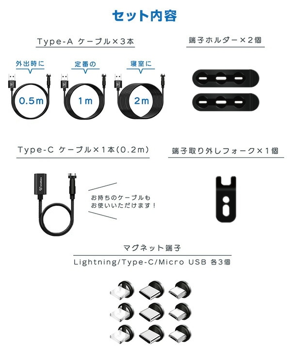 | 商品説明 | ●強力なネオジム磁石で簡単接続できるスマホ充電用USBケーブル ●専用端子を充電先(スマホなど)に差し込んでおけば充電時はケーブルを差し込む手間なく、磁石の力で簡単に接続可能 ●専用端子は3種類(ライトニング/タイプC/マイクロUSB)あり、1本のケーブルで全ての端子に接続可能 ●LEDライトを搭載しており、ケーブルをUSBアダプターに繋げておけば暗所でもケーブルがすぐに見つかる ●ケーブル付け根が180度に曲がり、磁石で接触しているので360度回る。横からの衝撃には外れるため破損しづらい ●充電端子穴の保護に繋がる。端子穴を塞いでおけるのでケーブルを挿す時の傷や、ホコリや水の侵入を防げる ●目や手の不自由な方に!両手でなければ出来なかった充電が片手で出来る便利さ!小さい穴に入れる作業が近づけるだけで充電できる楽さ!手先の作業が苦手や億劫な方には特にオススメ 【セット内容】 ●ケーブル3本(50cm/1m/2m):USB-Aオス→マグネット ●Type-C変換ケーブル1本(20cm):USB Type-Cメス→マグネット ●マグネット端子9個(Lightning/Type-C/MicroUSB 各3個) ●端子ホルダー 2個 ●端子取り外し用フォーク1個 【仕様】 ●出力(最大):5V/2.4A 12W ●動作確認端末(※工場調べ):iPhone 14/iPhone 13/iPhone 13 Pro/12/11/XR/8Plus/7/7Plus/6S/6/iPad Mini、Google Pixel 6/5/4/3/Galaxy S20/S10/S9/Note 9/LGV30/Huawei/Kindle/MP3/tablet pc/gaming gadget etc. |
