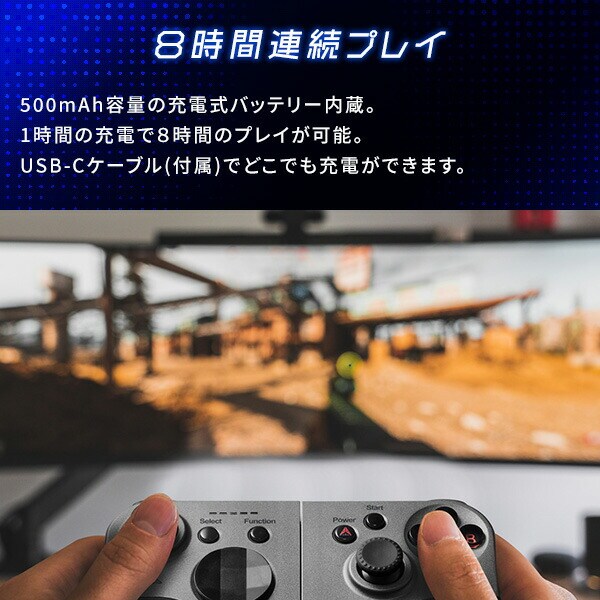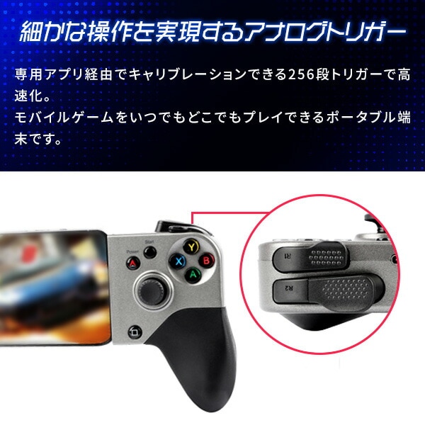 | 商品説明 | ●手にフィットする楽なグリップタイプ ●360度精密に調節できるスティック、デュアルハプティック振動モーターで迫力のあるプレイ ●Bluetooth、有線でPC、スマートフォン、テレビと自由自在に互換、マッピング可能(iOS非対応) ●1時間充電で最大8時間の連続プレイが可能 ●いつどこでもゲームが楽しめる!軽くて持ち運び楽々 ●精密なアクセルが必要なゲームで能力を発揮する256段階のアナログトリガー ●左右の持ち手にデュアルハプティックバイブレータが内蔵されており、躍動感あふれるダイナミックなゲームを体験 ●手軽なペアリングで、1度ペアリングすればOK ●直感的な操作を可能にするジャイロ機能対応 ●60フレーム/秒(16.6ms)の速度 モバイルの人気ゲームに対応 ●Android、iPhone、Windows、iOS、X-Cloud Stadia、Geforseに対応 ●スマートフォン対応:最大長さ165mm、厚さ9mmまで ●バッテリー:500mAh、充電式 ●伝送範囲:7~10m ●セット内容:本体、ポーチ、USB Type-Cケーブル、説明書 |
