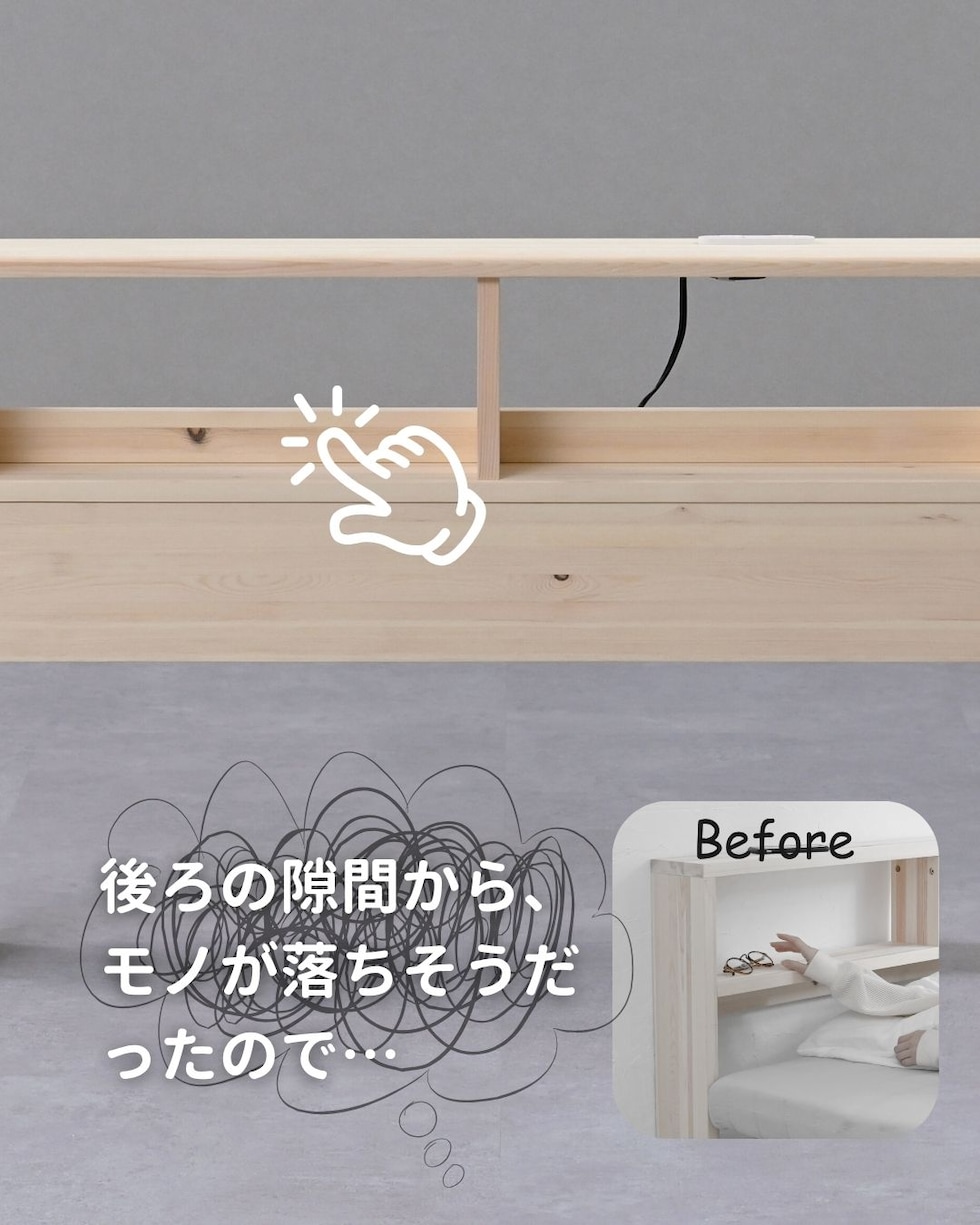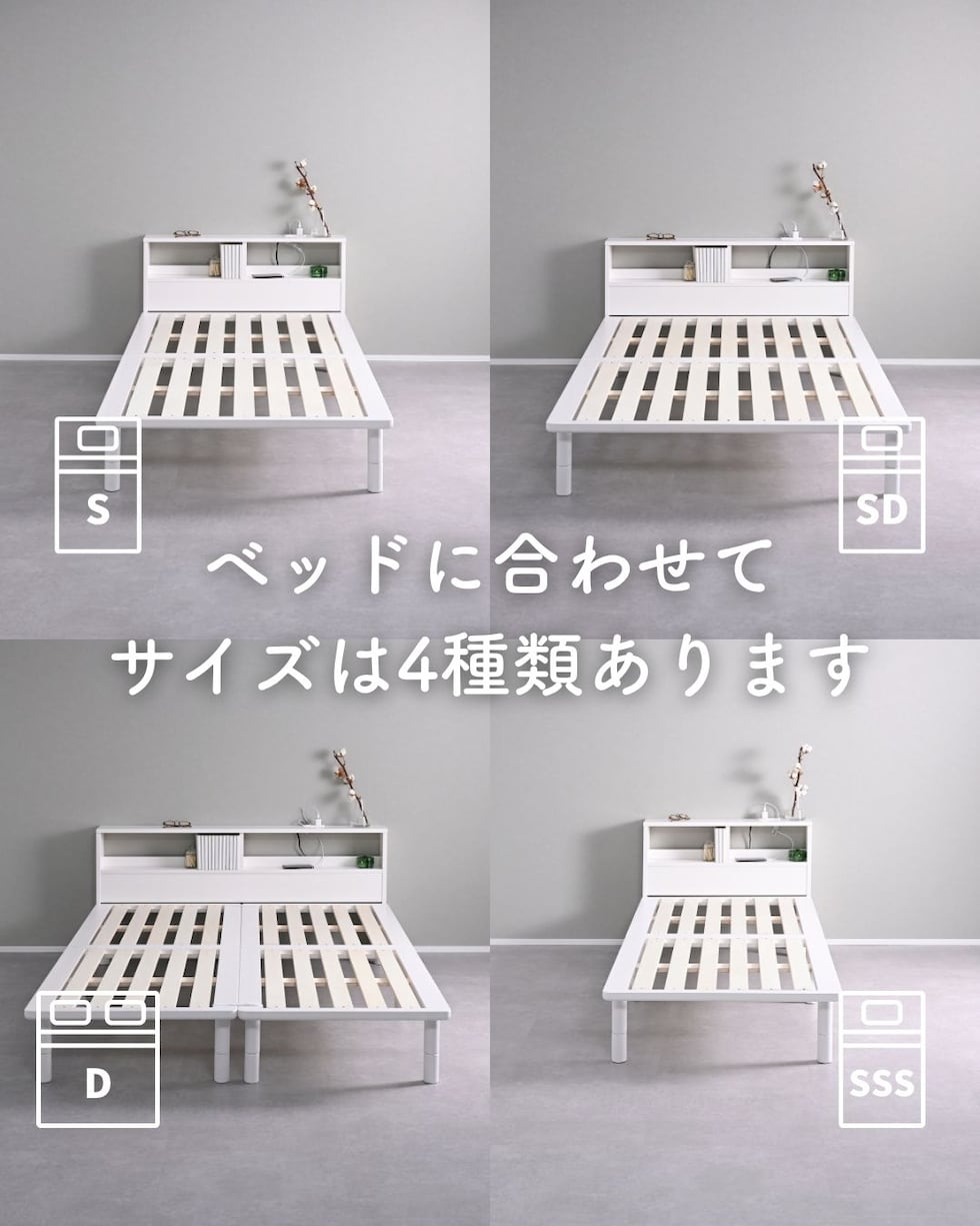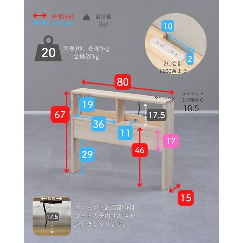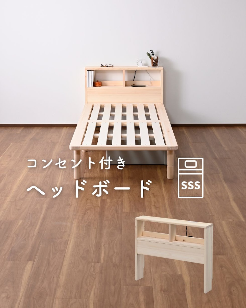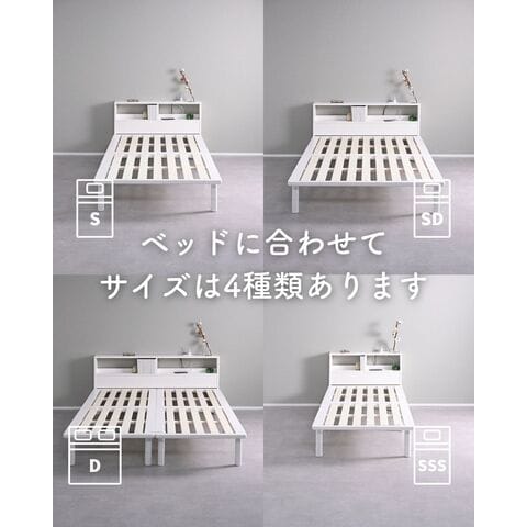 | 商品説明 | ●ドライバー(プラスとマイナス)があると組み立てやすいです。(六角レンチは付属) ●ベッドのヘッドボードにもなる奥行き15cmのスリムなラック ●枕元に棚が欲しい寝室に、後付けできる宮棚 ●従来品を見直して、掃除がしやすくモノが置きやすく変身 ●あたたかみのあるパイン材を使用し、角も安心のR加工でやさしい仕上げ ●棚内部には背面にこぼれ止めを設置 ●従来はオープンだった棚下にも幕板を追加 ●床から収納スペースまでの高さ:46cm ●下棚がなくなって、掃除もしやすいシンプルなつくり ●巾木カット加工で、壁付けしやすい設計 ●2口コンセント付きで、携帯電話の充電も可能 ●コンセントはホコリの侵入を防ぐスライド蓋式 ●コンセントの位置は、正面向かって右手側に配置 ●2口コンセント(合計1500Wまで)、コード長さ約1.8m ●コード孔があるので、棚の内部で充電も可能 ●収納部内寸(※): 【S】幅45 奥行11 高さ19cm 【SD】幅56 奥行11 高さ19cm 【D】幅66 奥行11 高さ19cm 【SSS】幅36 奥行11 高さ19cm ※コンセントのコードがあるため、一部棚の内寸高さが17.5cmほどの箇所がございます。 |
