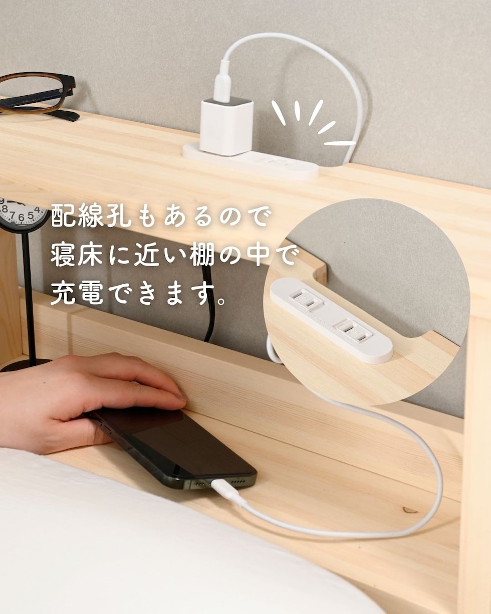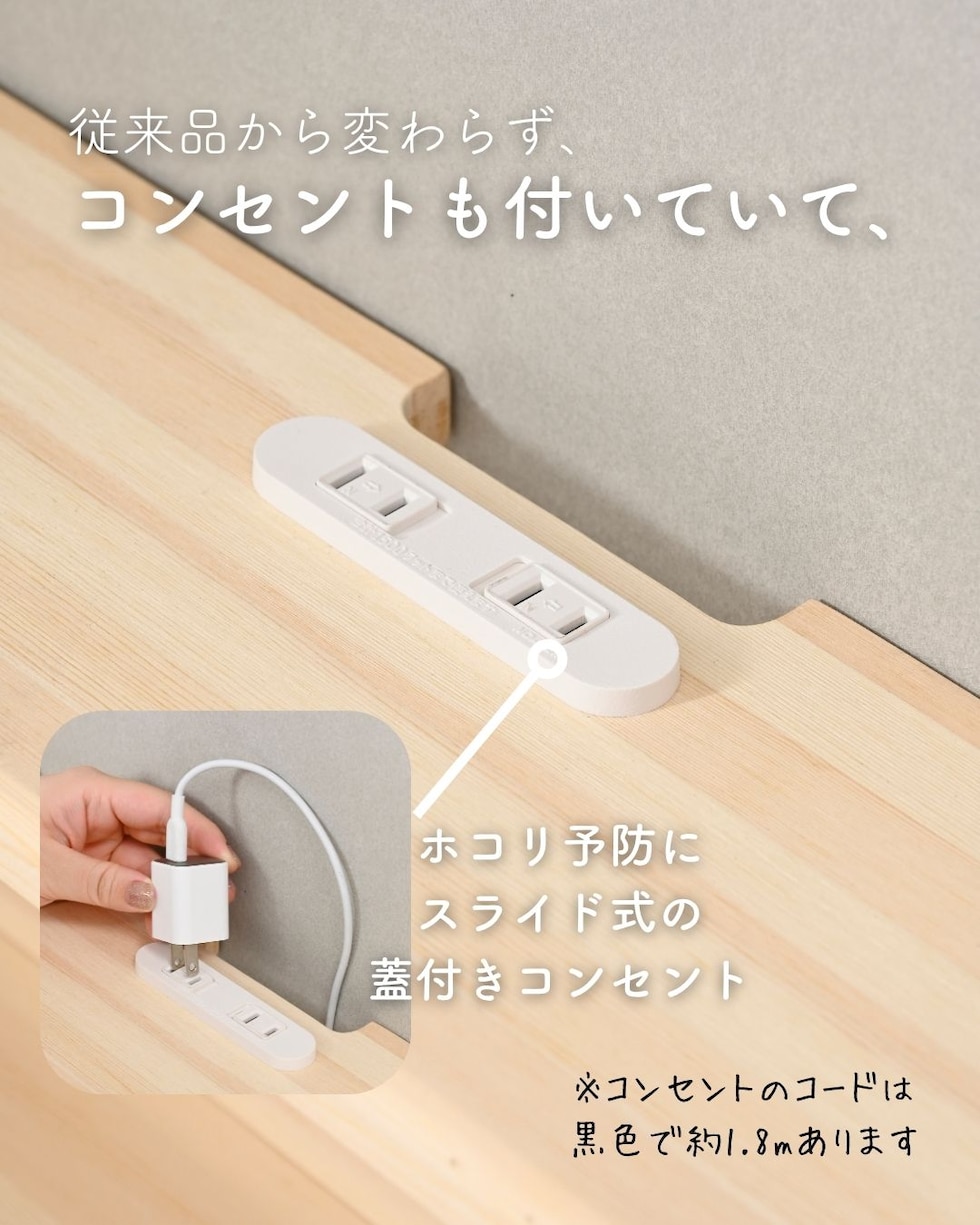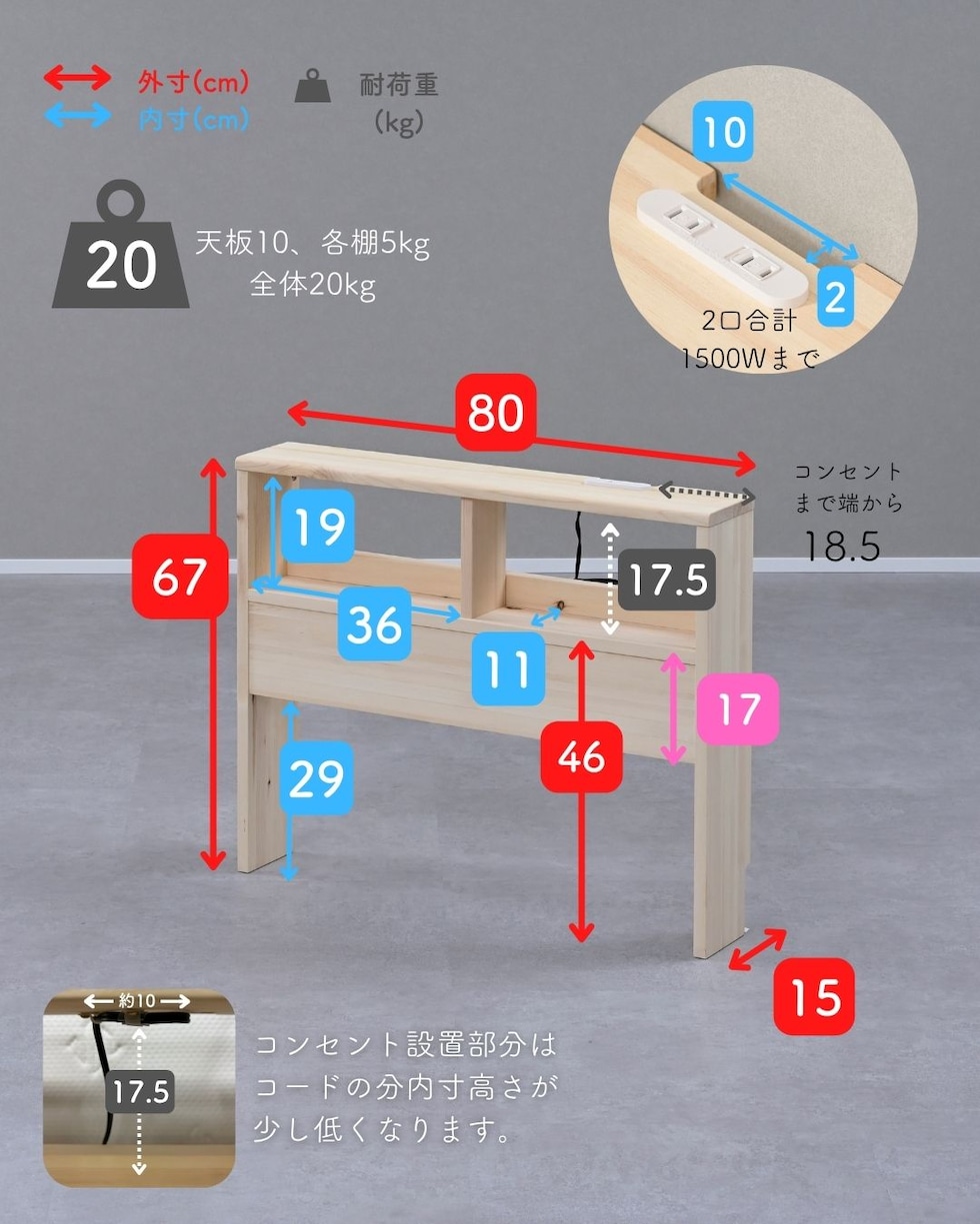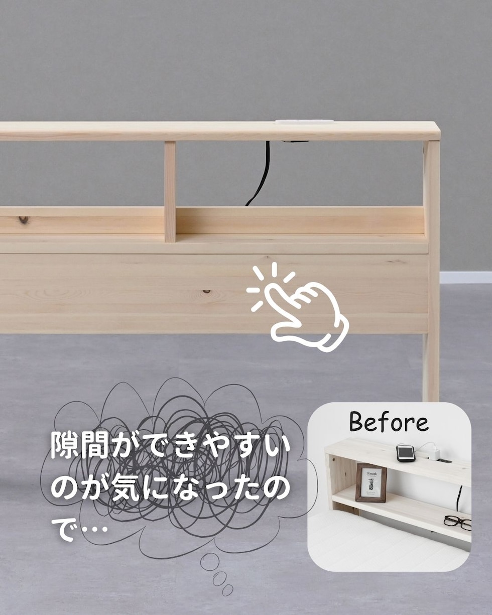 | 商品説明 | ●ドライバー(プラスとマイナス)があると組み立てやすいです。(六角レンチは付属) ●ベッドのヘッドボードにもなる奥行き15cmのスリムなラック ●枕元に棚が欲しい寝室に、後付けできる宮棚 ●従来品を見直して、掃除がしやすくモノが置きやすく変身 ●あたたかみのあるパイン材を使用し、角も安心のR加工でやさしい仕上げ ●棚内部には背面にこぼれ止めを設置 ●従来はオープンだった棚下にも幕板を追加 ●床から収納スペースまでの高さ:46cm ●下棚がなくなって、掃除もしやすいシンプルなつくり ●巾木カット加工で、壁付けしやすい設計 ●2口コンセント付きで、携帯電話の充電も可能 ●コンセントはホコリの侵入を防ぐスライド蓋式 ●コンセントの位置は、正面向かって右手側に配置 ●2口コンセント(合計1500Wまで)、コード長さ約1.8m ●コード孔があるので、棚の内部で充電も可能 ●収納部内寸(※): 【S】幅45 奥行11 高さ19cm 【SD】幅56 奥行11 高さ19cm 【D】幅66 奥行11 高さ19cm 【SSS】幅36 奥行11 高さ19cm ※コンセントのコードがあるため、一部棚の内寸高さが17.5cmほどの箇所がございます。 |