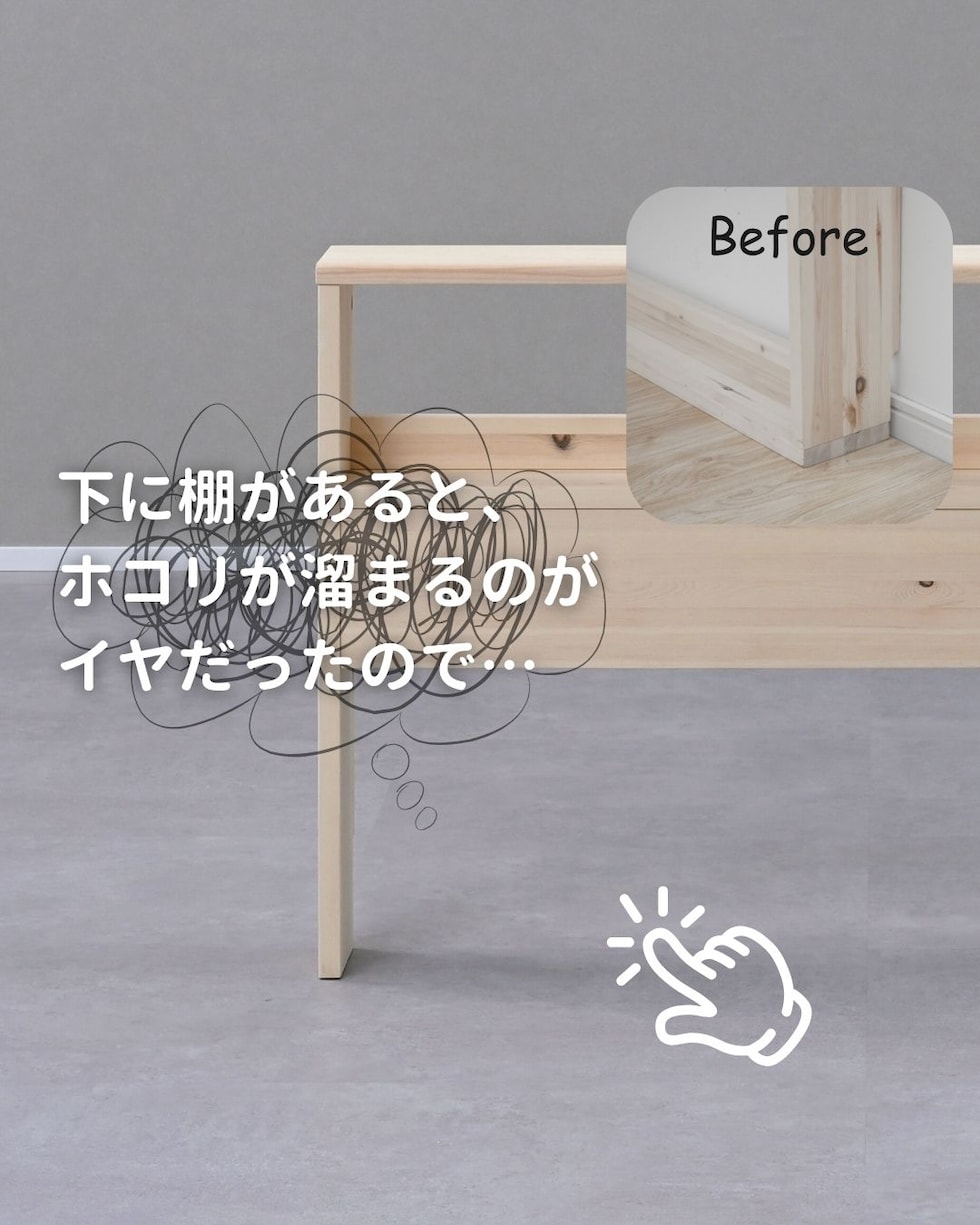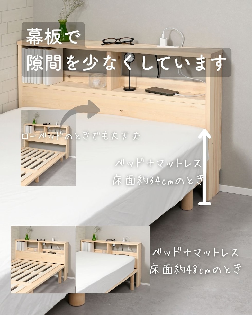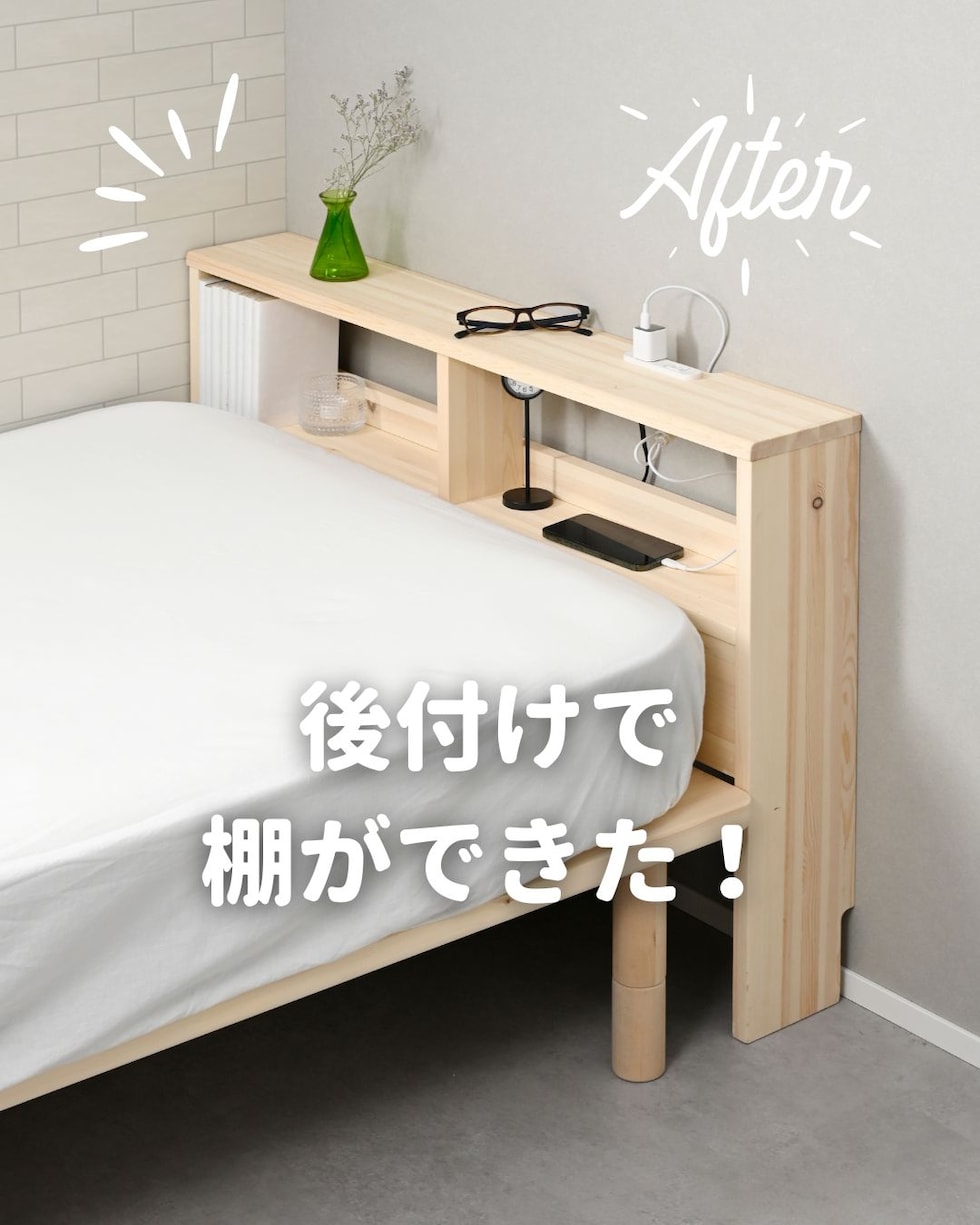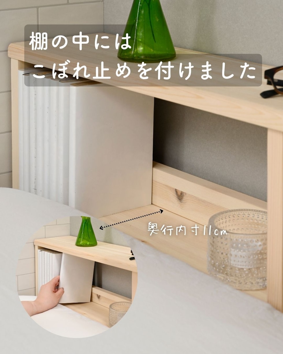 | 商品説明 | ●ドライバー(プラスとマイナス)があると組み立てやすいです。(六角レンチは付属) ●ベッドのヘッドボードにもなる奥行き15cmのスリムなラック ●枕元に棚が欲しい寝室に、後付けできる宮棚 ●従来品を見直して、掃除がしやすくモノが置きやすく変身 ●あたたかみのあるパイン材を使用し、角も安心のR加工でやさしい仕上げ ●棚内部には背面にこぼれ止めを設置 ●従来はオープンだった棚下にも幕板を追加 ●床から収納スペースまでの高さ:46cm ●下棚がなくなって、掃除もしやすいシンプルなつくり ●巾木カット加工で、壁付けしやすい設計 ●2口コンセント付きで、携帯電話の充電も可能 ●コンセントはホコリの侵入を防ぐスライド蓋式 ●コンセントの位置は、正面向かって右手側に配置 ●2口コンセント(合計1500Wまで)、コード長さ約1.8m ●コード孔があるので、棚の内部で充電も可能 ●収納部内寸(※): 【S】幅45 奥行11 高さ19cm 【SD】幅56 奥行11 高さ19cm 【D】幅66 奥行11 高さ19cm 【SSS】幅36 奥行11 高さ19cm ※コンセントのコードがあるため、一部棚の内寸高さが17.5cmほどの箇所がございます。 |