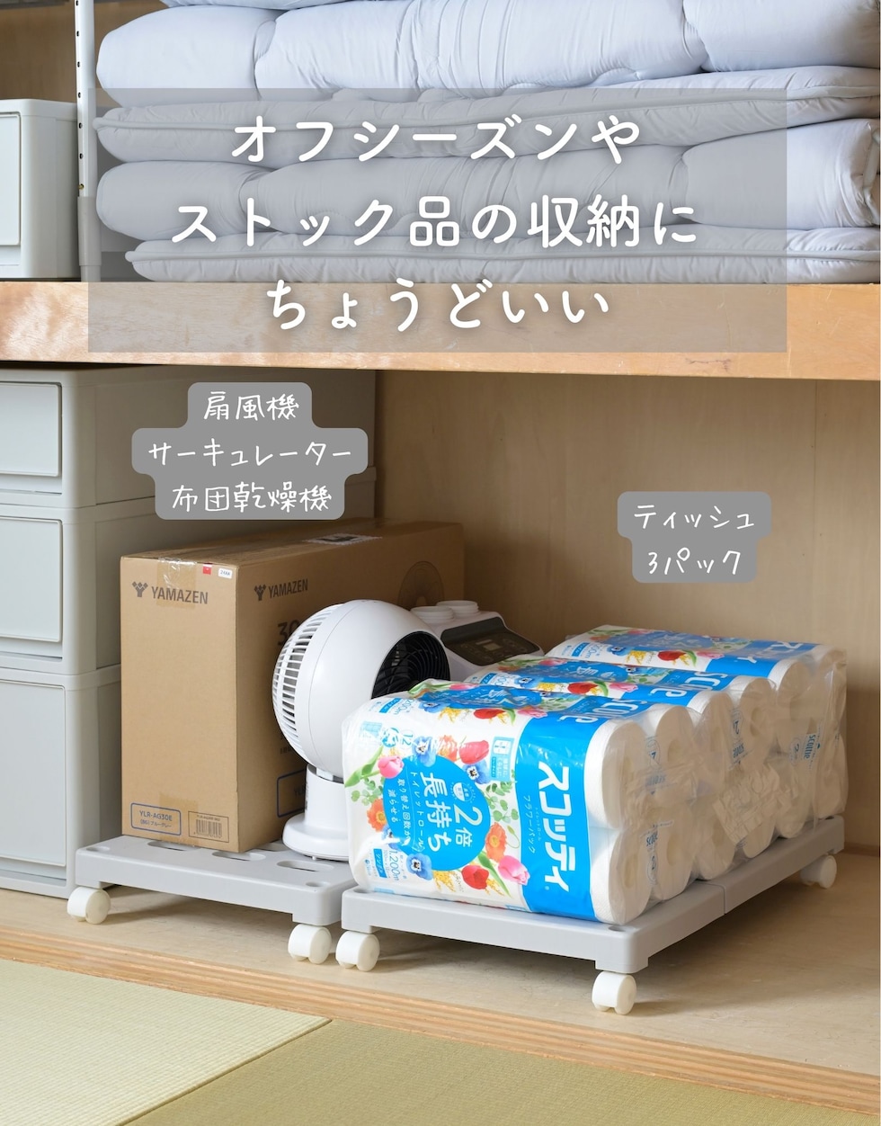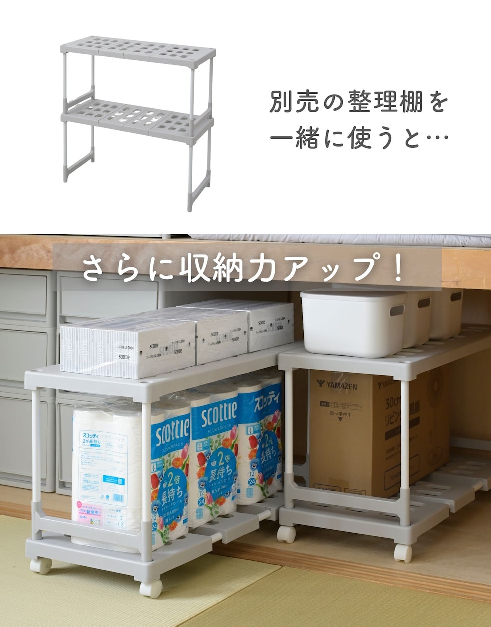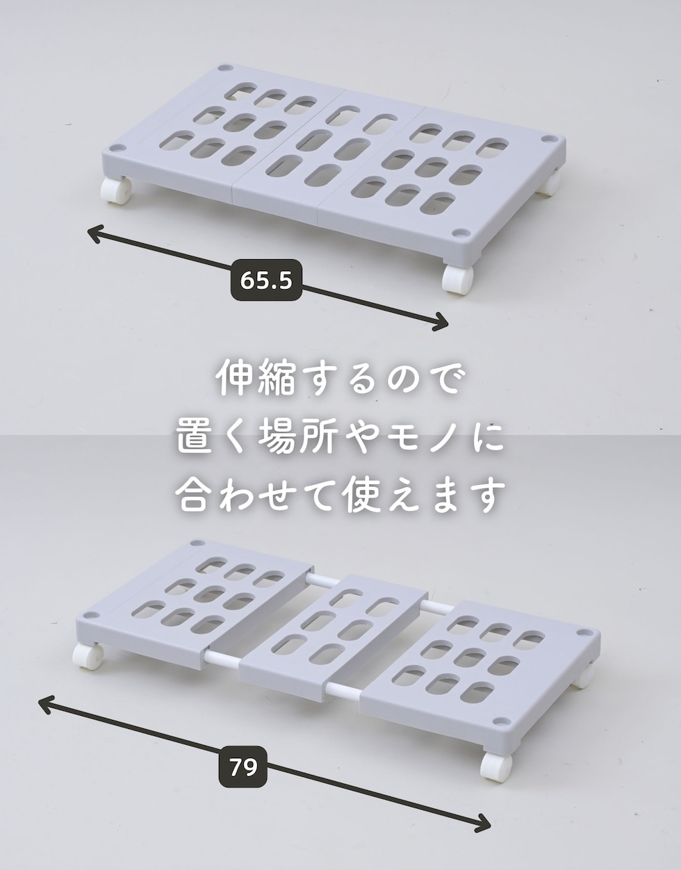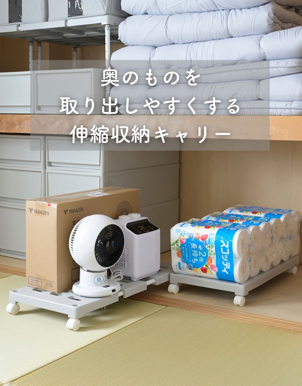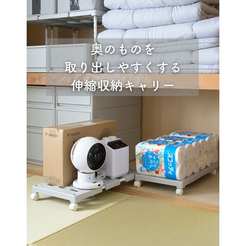 | 商品説明 | ●押入れの下段で使いやすいキャリー ●65.5-79cmまでの伸縮式 ●段差も超えられるキャスターで奥のものも取り出しかんたん ●オフシーズンの家電、ティッシュやペットボトルなどストック品の収納にぴったり ●棚板は通気を配慮した通気口デザイン ●チェストや布団などベッド下収納でも台車のように使える ●耐荷重: 20kg ※別売の整理棚を付けることで、キャスター付きの収納ラックとしても使えます。 |