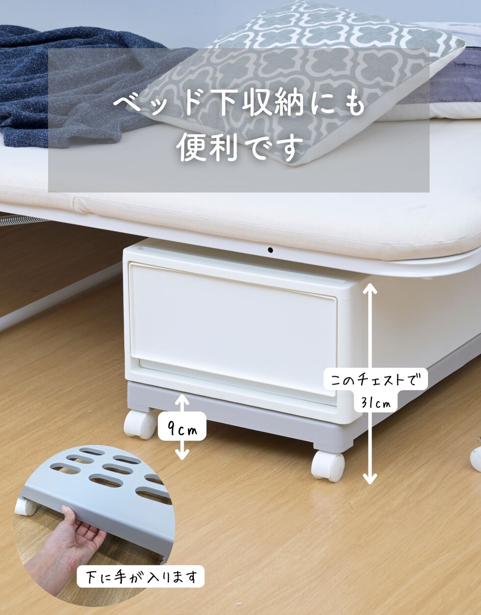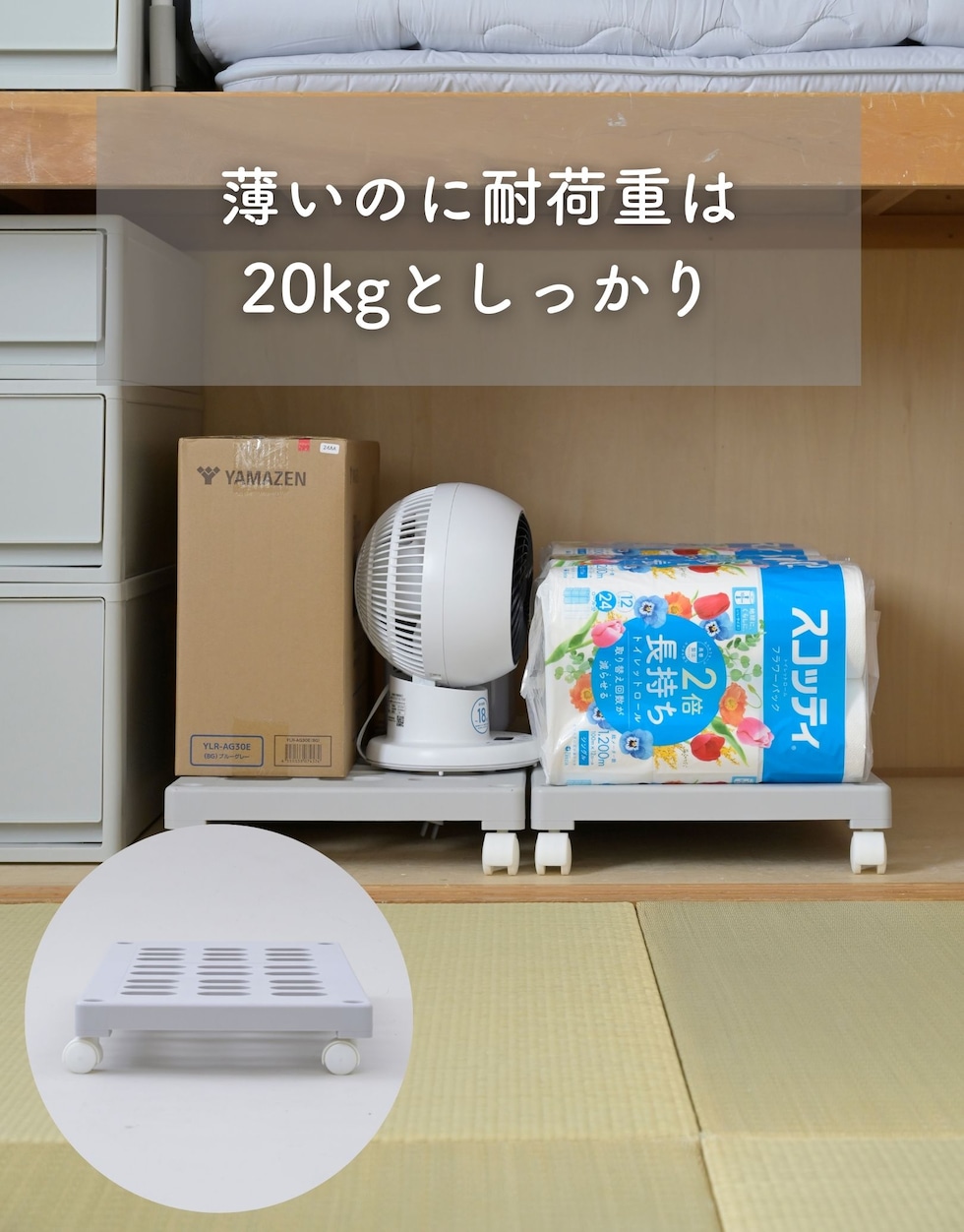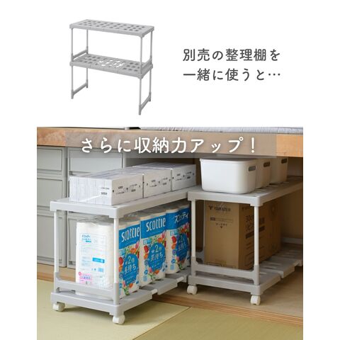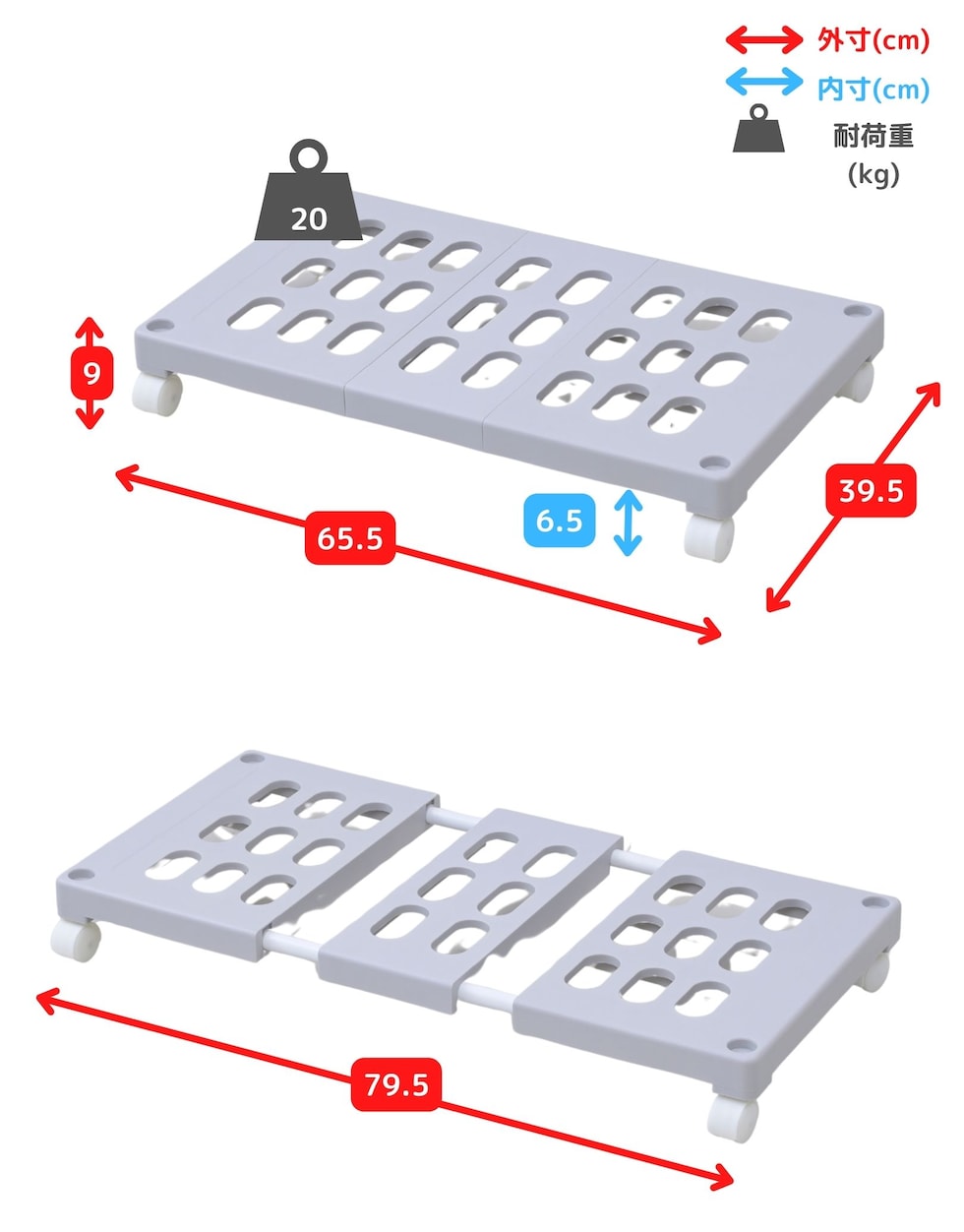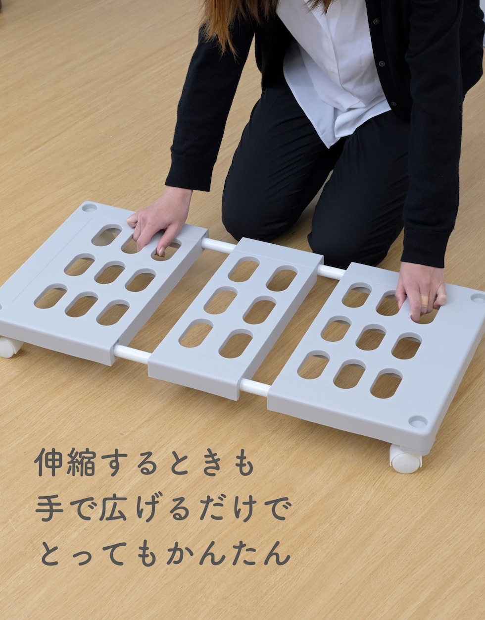 | 商品説明 | ●押入れの下段で使いやすいキャリー ●65.5-79cmまでの伸縮式 ●段差も超えられるキャスターで奥のものも取り出しかんたん ●オフシーズンの家電、ティッシュやペットボトルなどストック品の収納にぴったり ●棚板は通気を配慮した通気口デザイン ●チェストや布団などベッド下収納でも台車のように使える ●耐荷重: 20kg ※別売の整理棚を付けることで、キャスター付きの収納ラックとしても使えます。 |