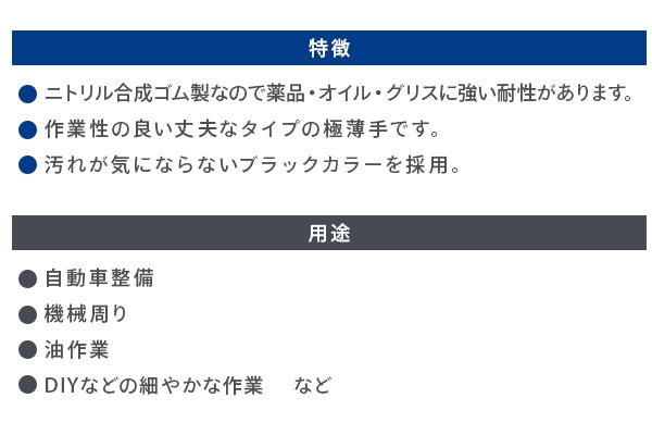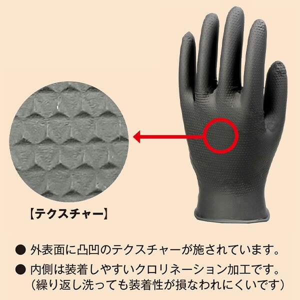| 商品説明 | ●50枚入り ●丈夫で油にも強いニトリル素材 ●強度やグリップ性に優れているため、ハードな作業にも最適 ●汚れが気にならないブラックカラー ●外表面に凸凹のテクスチャーが施された仕様 ●内側は装着しやすいクロリネーション加工済 |