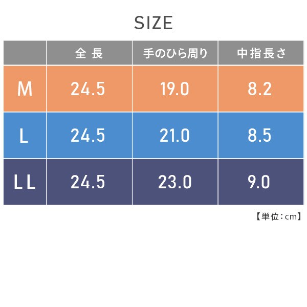 | 本体サイズ | M:手のひら周り19、中指長さ8.2cm L:手のひら周り21、中指長さ8.5cm LL:手のひら周り23、中指長さ9cm 全長:24.5cm 掌部(凸部)厚さ:0.18mm 手側面平滑部厚さ:0.1mm |