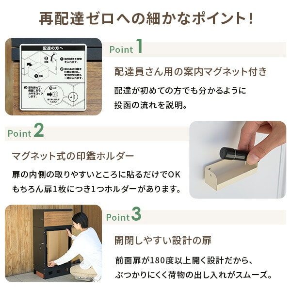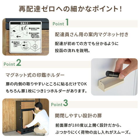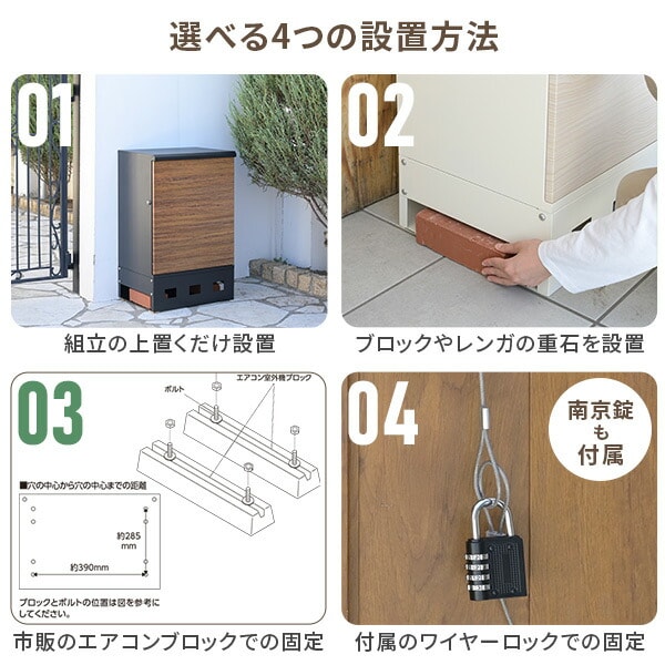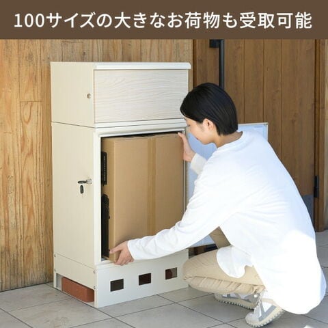 | 商品説明 | ●簡単組立の大容量2段タイプの宅配ボックス ●屋外設置が可能な防雨設計(防水規格 IPX4取得) ●雨の水滴から宅配物を守ります ※完全防水ではありません ●大容量:(上段)約24L、(下段)約70L ※最大 (上段)41×33×18cm、(下段)41×33×51.5cmまで投函可能 ●宅配サービスの規格対応サイズ:(上段)60-80サイズ、(下段)100サイズ ※あくまで目安となります ●地面の結露や湿気、ホコリから荷物を守る底上げ仕様を採用 ●ブロックやレンガなどの重石を設置できるのでアンカー不要 ●市販のエアコン室外機ブロックを使用して取付可能 ●本体底部には結露から荷物を守るための穴付き底板仕様 ●アウトセット扉を採用することで正面から本体の側板が見えずスタイリッシュな見た目に ●おうちに馴染むシンプルな木目調デザイン ●高級な風合いの大理石調デザイン ●シリンダーワンプッシュ錠:簡単操作で押すだけで施錠可能 ●宅配業者様向けメッセージプレートと印鑑置きは磁石で好きな位置に貼り付けが可能 ●盗難・転倒防止用ワイヤー付属 ●付属品:印鑑置き(マグネット2個付き)、宅配業者様向けメッセージプレート(マグネット)、鍵×2本、盗難防止用ワイヤー(ダイヤル式鍵付き)、プラスドライバー ※2025年3月より、販路限定カラーのブラック/大理石調を追加しました |