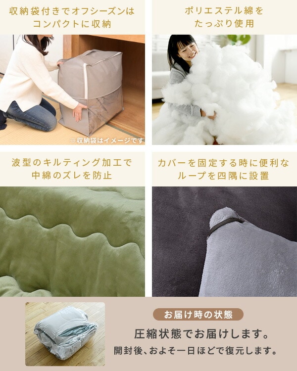 | 商品説明 | 電源コード:中間入切イッチ ●電源コード長さ:3m ●コード収納ボックス付 【105cmタイプ】 ●ヒーター型番:MS-303H ●消費電力:300W ●電気代目安(1時間あたり):(強)5円、(弱)2.5円 【こたつ布団】 ●さらふわな肌触りのフランネル生地を両面に使用 ●取っ手付き収納袋付きでオフシーズンもコンパクトに収納 ●リバーシブルで使用可能 ●※圧縮状態でお届けします。開封後、およそ1日ほどで復元します。 ※お手入れは品質表示に従って行ってください。誤ったお手入れは、品質低下・破損の原因となります。 |