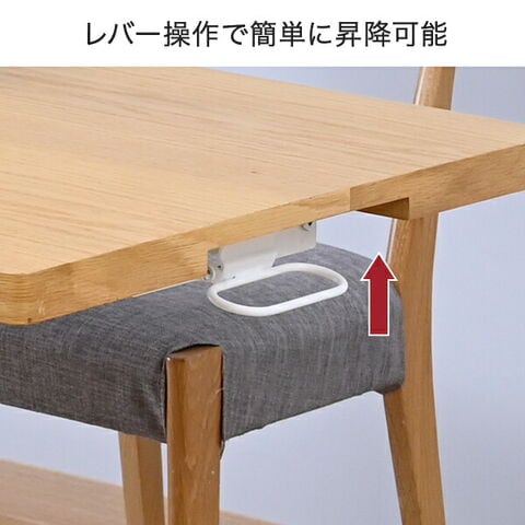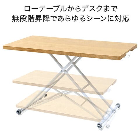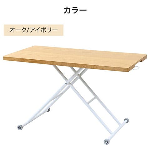 | 商品説明 | ●油圧式で無段階に高さ調節できるテーブル ●ローテーブルからデスクまで、あらゆるシーンに対応 ●レバー操作で簡単に昇降可能 ●天板は木目が美しいオーク突板仕上げ ●片側は可動式のキャスターなので移動もラクラク ●天板サイズ:幅120cm 奥行60cm ●天板耐荷重:20kg |