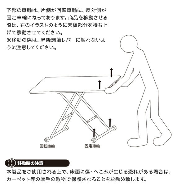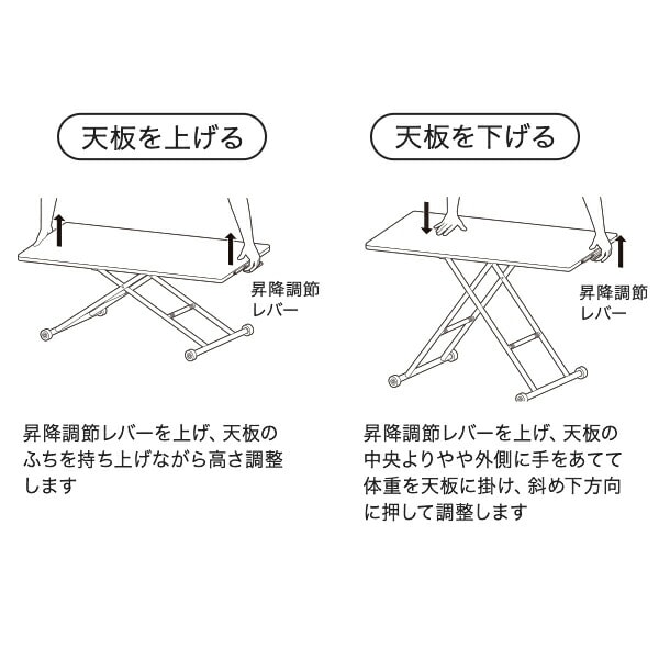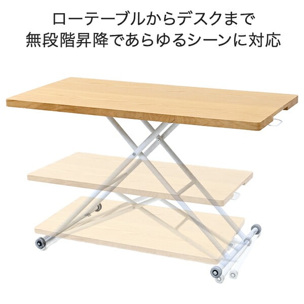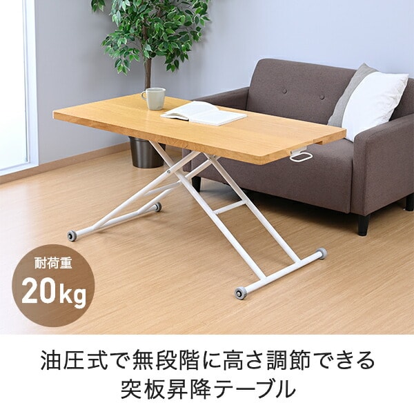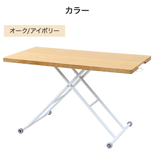| 商品説明 | ●油圧式で無段階に高さ調節できるテーブル ●ローテーブルからデスクまで、あらゆるシーンに対応 ●レバー操作で簡単に昇降可能 ●天板は木目が美しいオーク突板仕上げ ●片側は可動式のキャスターなので移動もラクラク ●天板サイズ:幅120cm 奥行60cm ●天板耐荷重:20kg |