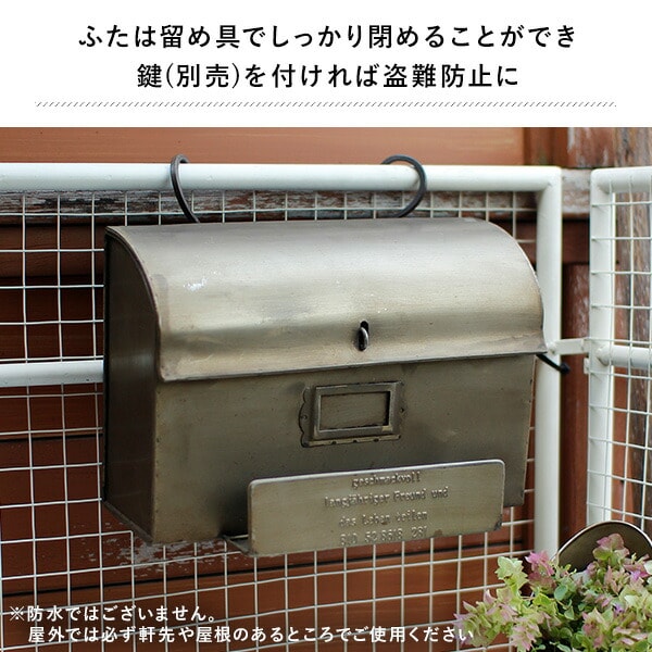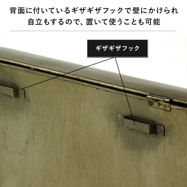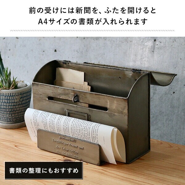 | 商品説明 | ●使うほど増える愛着と味わいで唯一無二になる、メンズライクな佇まいがかっこいいおしゃれポスト ●前の受けには新聞を、蓋を開けるとA4サイズの書類が入れられます ●フタは留め具でしっかり閉めることができ、鍵を付ければ盗難防止に ●背面に付いているギザギザフックで壁にかけられ、自立もするので置いて使うことも可能 ●屋内での書類の整理にもおすすめ ●ヨーロッパのアンティークショップでみつけたような味わい深い大人のシリーズ ※防水ではございません。屋外では必ず軒先や屋根のあるところでご使用ください |