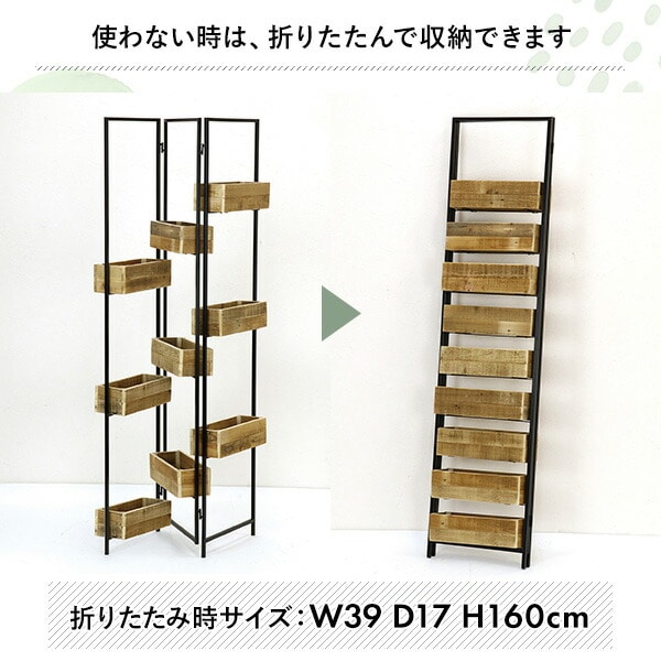 | 商品説明 | ●アイアンのパーテーションにリサイクルパイン材のボックスがセットされた面で植物を飾れるスタンド ●植物でアレンジすれば、素敵なパーテーションが出来上がります ●仕切りが欲しい場所で奥行のある空間をデザインできます ●植物の世話は苦手という方は、フェイクグリーンなどを使えばお手入れも簡単で、室内にグリーンを添えることができます ●ボックスは家具やドアなどで使用されていたパイン材を丁寧に加工しアップサイクルした「リクレイムウッド」を使用。傷跡や木目模様など個体差がありますが、生まれ変わった木の雰囲気をお楽しみください ●折りたたみ式 ●折りたたみ時サイズ:幅39×奥行17×高さ160cm ●木箱:幅35×奥行13×高さ10cm |