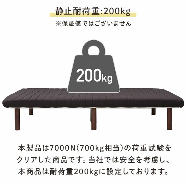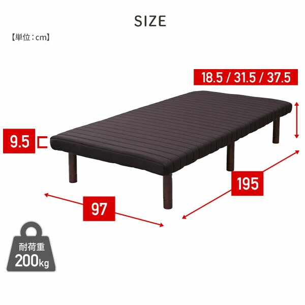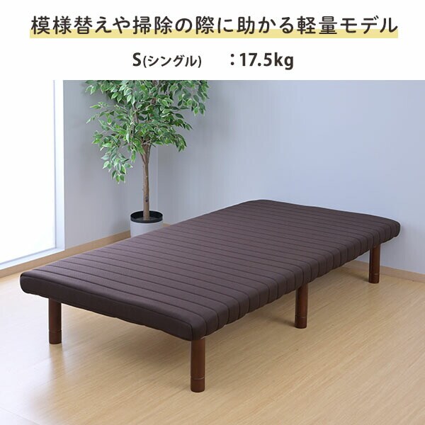 | 商品説明 | ●圧縮梱包で玄関先までお届け、開封後約1日で復元します。(環境により時間が前後します。) ●工具不要(六角レンチ付属) ●かため(187N)のウレタンフォームを使ったマットレスタイプ ●脚の高さは3段階で変更可能: 6/19/25cm ●模様替えや掃除の際に助かる軽量モデル ●マットレス内部には、通気性の良いすのこのフレームを内蔵 ●静止耐荷重:200kg(保証値ではございません。) 本製品は7000N(700kg相当)の荷重試験をクリアした商品です。 当社では安全を考慮し、本商品は耐荷重200kgに設定しております。 ●【実用新案】取得済みの独自構造で耐荷重も安心 ●本体内蔵の木枠と、後付の補強枠・脚を取り付けて完成 ●マットレスの張地は滑らかなポリエステル素材を使用 ●マット厚: 9.5cm ●脚から脚まで幅: 77.5cm |