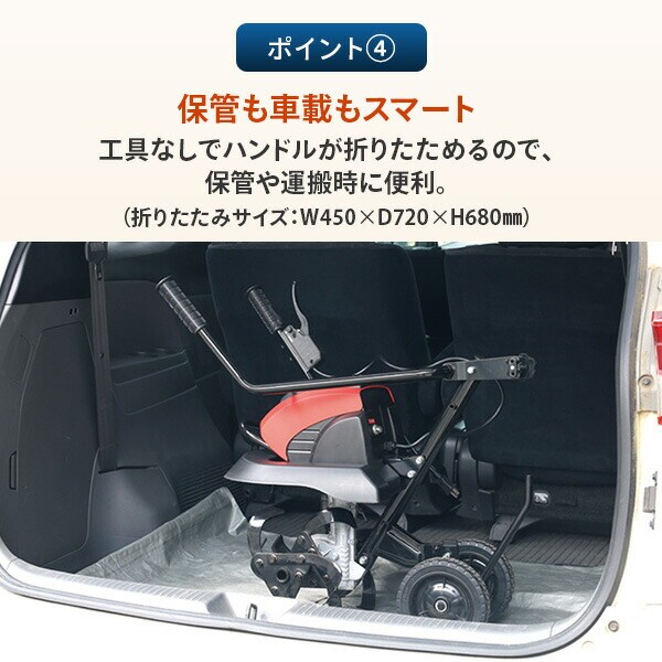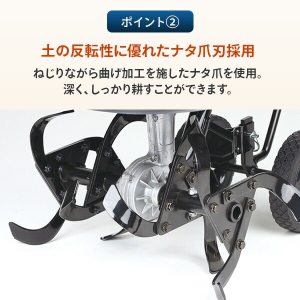 | 商品説明 | ●電圧:AC100V(50/60Hz) ●電流:14A ●消費電力:1400W ●耕幅:450mm ●耕深:200mm ●爪径:280mm ●刃形:ナタ爪刃 ●定格時間:30分 ●コード長:35cm ●耕刃回転数:140min-1 ●耕うん目安面積:約30坪 ●騒音値:約88dB(1m四方平均) ●家庭菜園に最適な小型タイプ ●ハンドル部分は折りたたみが出来て収納、持ち運びに便利 ●家庭のコンセントに繋げればすぐに使用可能 ●タイヤ付で移動も簡単 ●土の反転性に優れたナタ爪刃を採用 ●延長コード使用時にコードを逃がす巻き込み防止肩掛けベルトを付属 ●メーカー保証期間:1年 ●付属品:延長コード10m×1、スパナ10/12mm×1、スパナ13/16mm×1、結束バンド×2、延長コード巻き込み防止肩掛けベルト×1、取り扱い説明書、保証書 |
