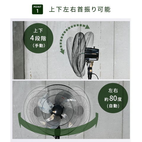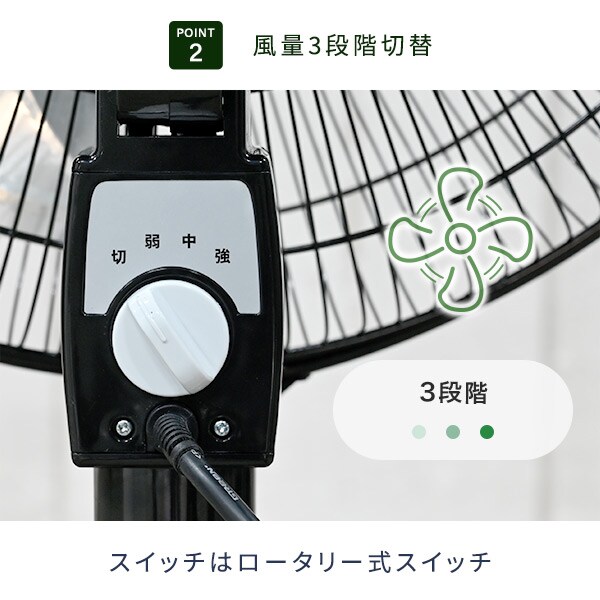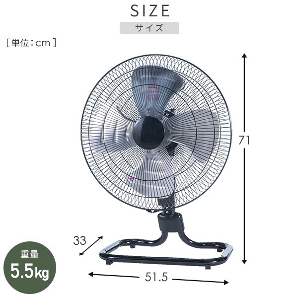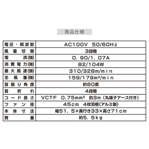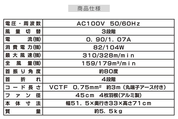 | 商品説明 | ●電源:AC100V(50/60Hz) ●消費電力:82W/104W(50/60Hz) ●電気代目安(1時間あたり):約2.5円/約3.2円(50/60Hz) ●最大風速:310/328 m/min (50/60Hz) ●最大風量:159/179 m^3/min (50/60Hz) ●操作方法:ロータリー式スイッチ ●風量:3段階(弱・中・強) ●ファン:45cm4枚(アルミ羽) ●首振り:左右約80度 ●上下角度調節:上下4段階(手動式) ●電源コード長さ:約3m ●騒音値:64/67dB ●メーカー保証:1年間 |