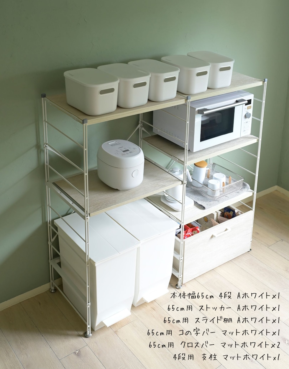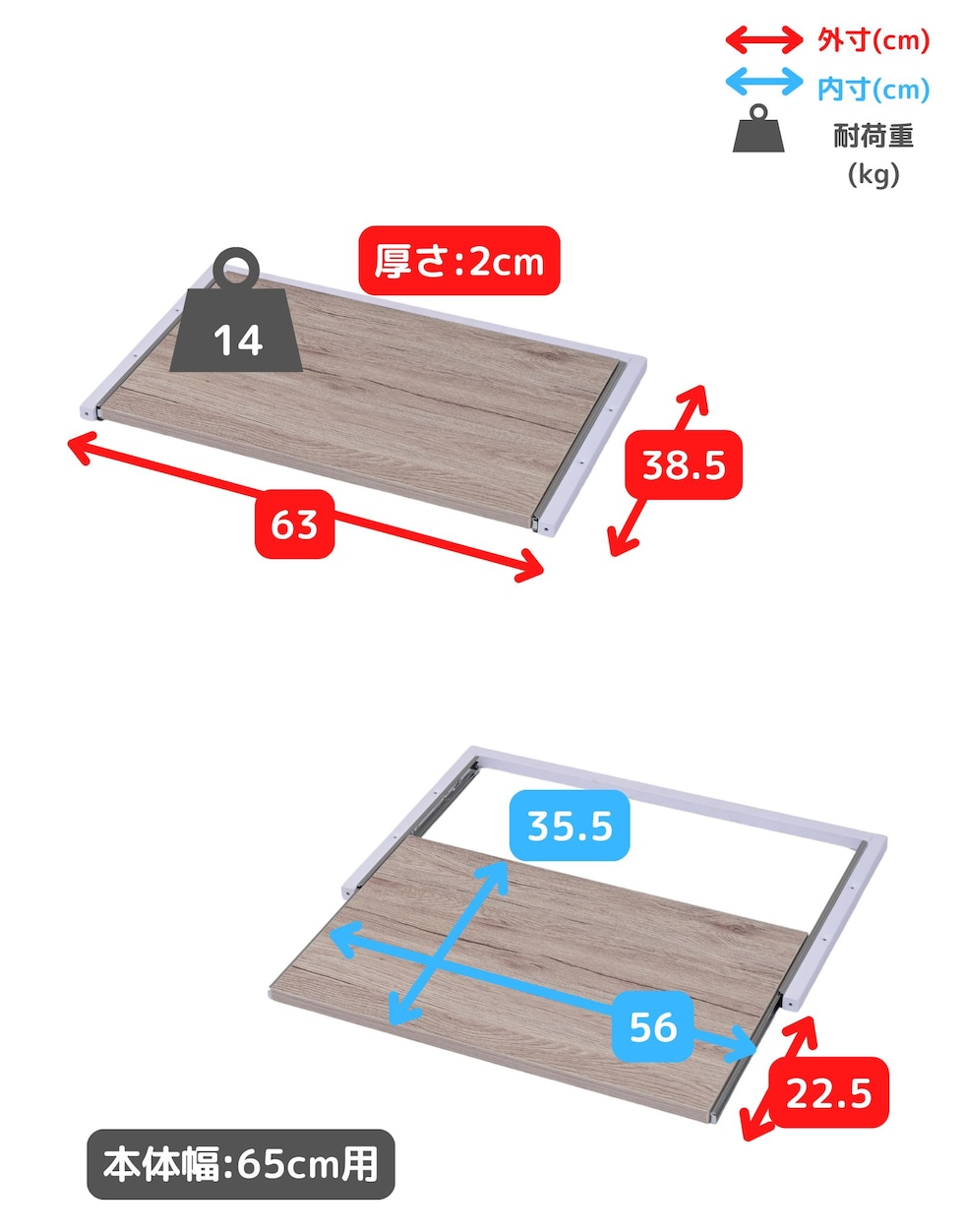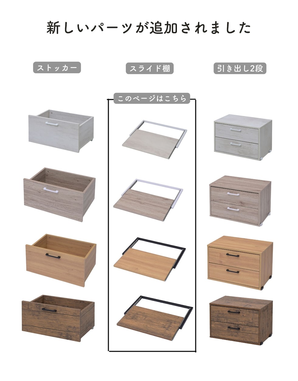 | 商品説明 | ●※本ページはオプションパーツ販売ページです。本体は別売りです。 【取り付け時の注意事項】 ※棚板の下でトレーとして使う場合は、2人以上ですと設置しやすいです。 ※本体フレームの桟、下から10段目までの間に取り付けてください。 ※5段で使う場合、フレームの連結部分には取り付けできません。 ※キャスターと併用はできません。 ※連結時、コの字バーと並列はできません。 ●ウッドシェルフに後付けできる専用スライド棚 ●本体幅65cm用 ●レール式でスムーズな開閉 ●棚板の下に付けるとちょい置きできるトレーに ●木の質感があってお手入れもかんたん ●キッチン家電も省ペースで収納 ●内寸 幅: 56、奥行き: 33.5cm ●スライド幅: 22cm ●耐荷重: 14kg ※ラック本体の全体耐荷重は商品サイズにより異なるため、ラック本体よりご確認お願いします。 |