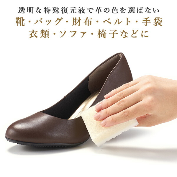 | 商品説明 | ●あきらめていた革のキズ、擦れ、剥がれを修復 ●特殊樹脂リキッドが表面層を再現、新品の状態に近付けます ●仕上げオイルやクリームのように艶を与えるだけじゃなくキズ、乾燥をコーティングし目立ちにくくします ●革の色を選ばないからこの1本でさまざまな物に使えます ●靴、バッグ、財布、ベルト、手袋、衣類、ソファ、椅子に ※合成皮革もOK |