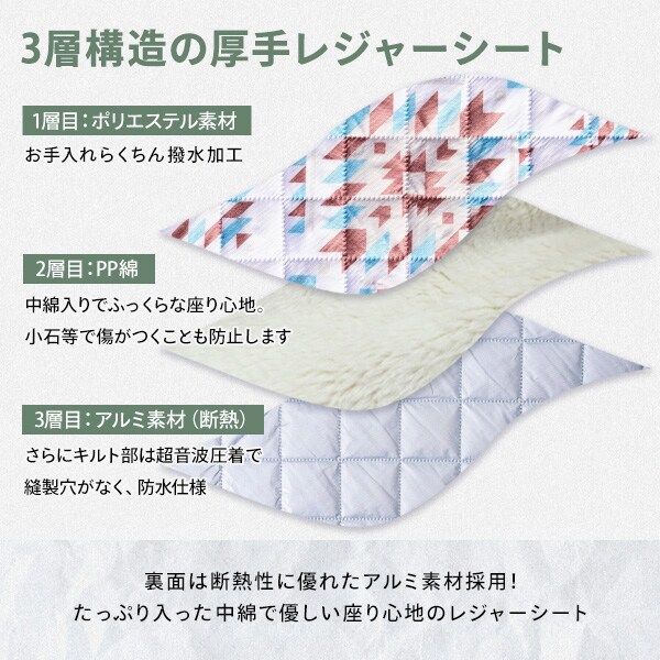 | 材質 | 表面:ポリエステル(撥水) 中材:綿 裏面:アルミ(断熱・防水) |