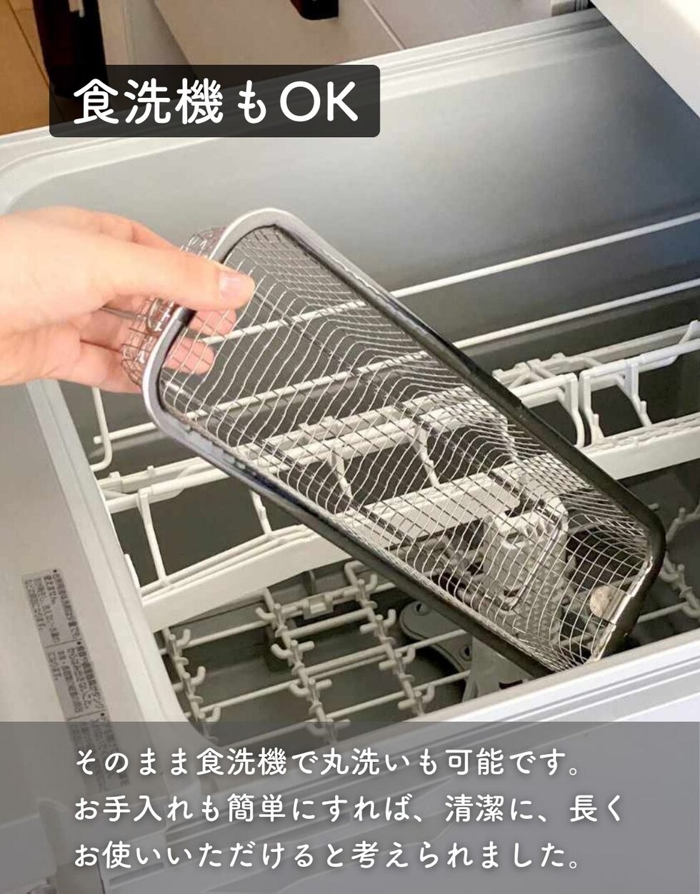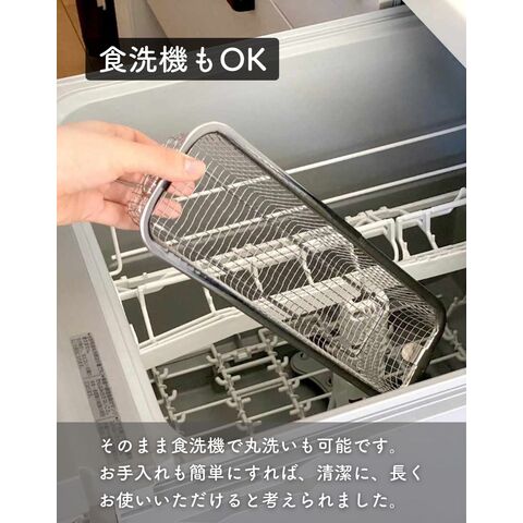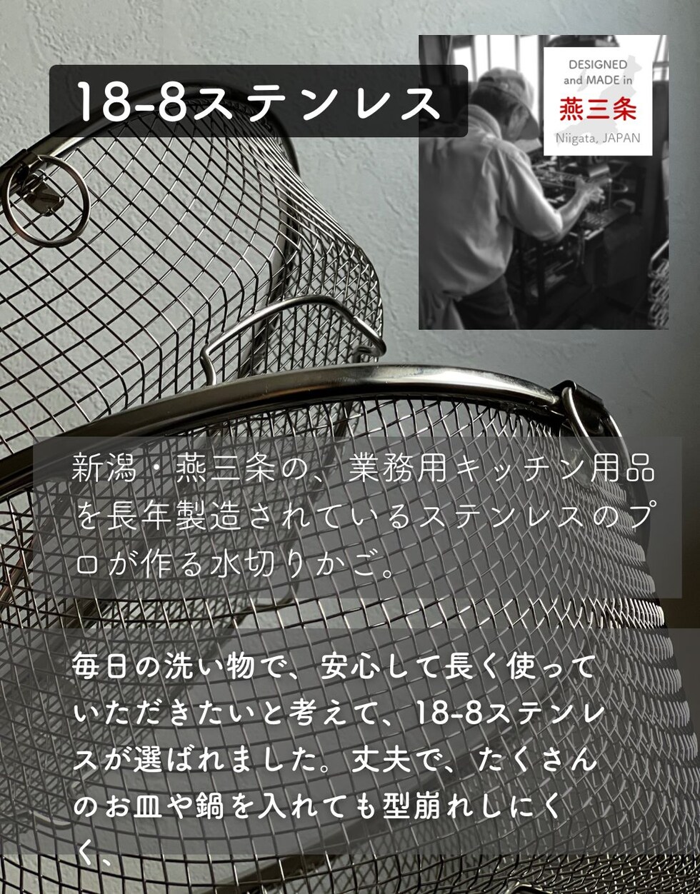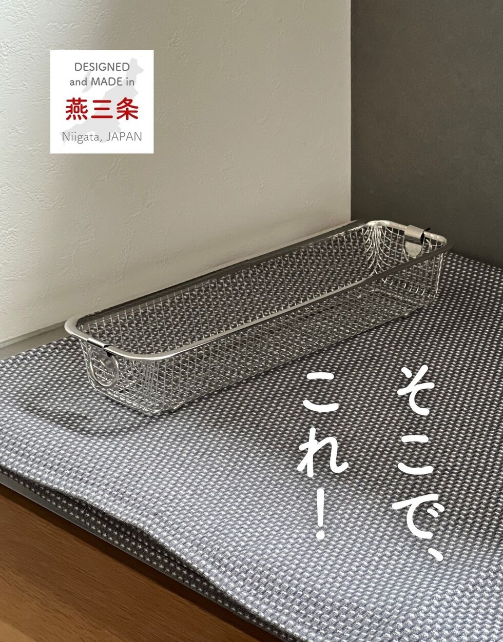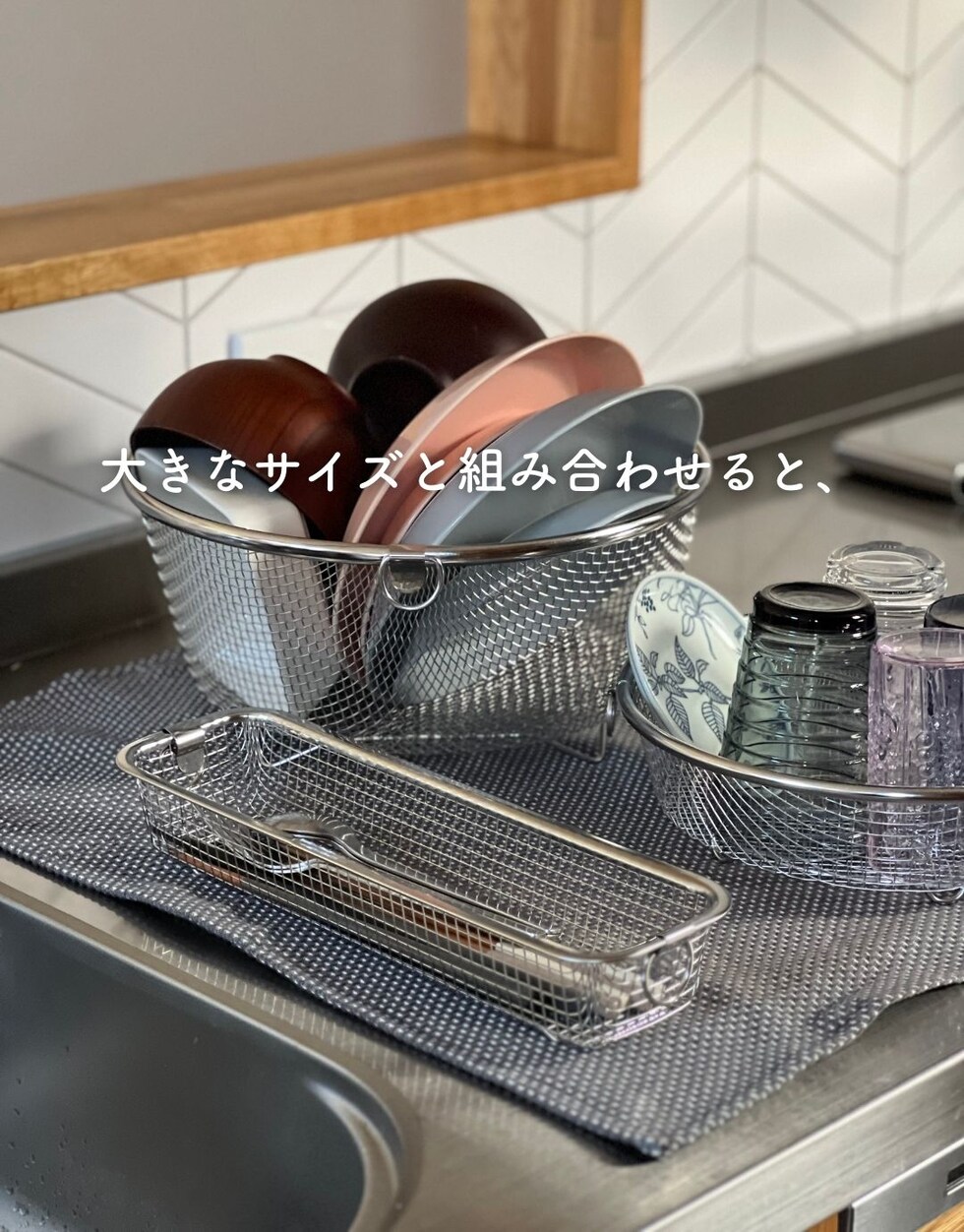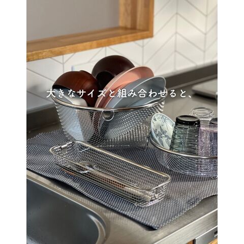 | 商品説明 | ●食洗機で丸洗いもできる、コンパクトな水切りカゴ ●暮らしのスタイルに合わせて使い分けできる、豊富なサイズ展開 ●食器を洗うときだけ取り出して使うことで、シンク周りを広く活用 ●食洗器で丸洗いもOK ●脚高なので、隙間をつくって水切り可能 ●使わないときはリングで吊り下げ収納でき、重ねて収納も可能 ●シンプルなデザインと、燕三条の技術が光る日本製の美しい仕上がりで滑らかな手触り●野菜などのザルとしても活躍 ● ▼スリム ●お箸やスプーン、フォークなど、細かいカトラリー類の水切りに便利なサイズ ●内寸: 幅27x奥行6x深さ4.5cm ●耐荷重: 約1kg |