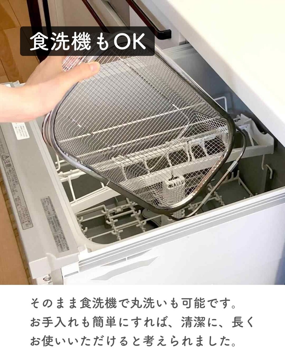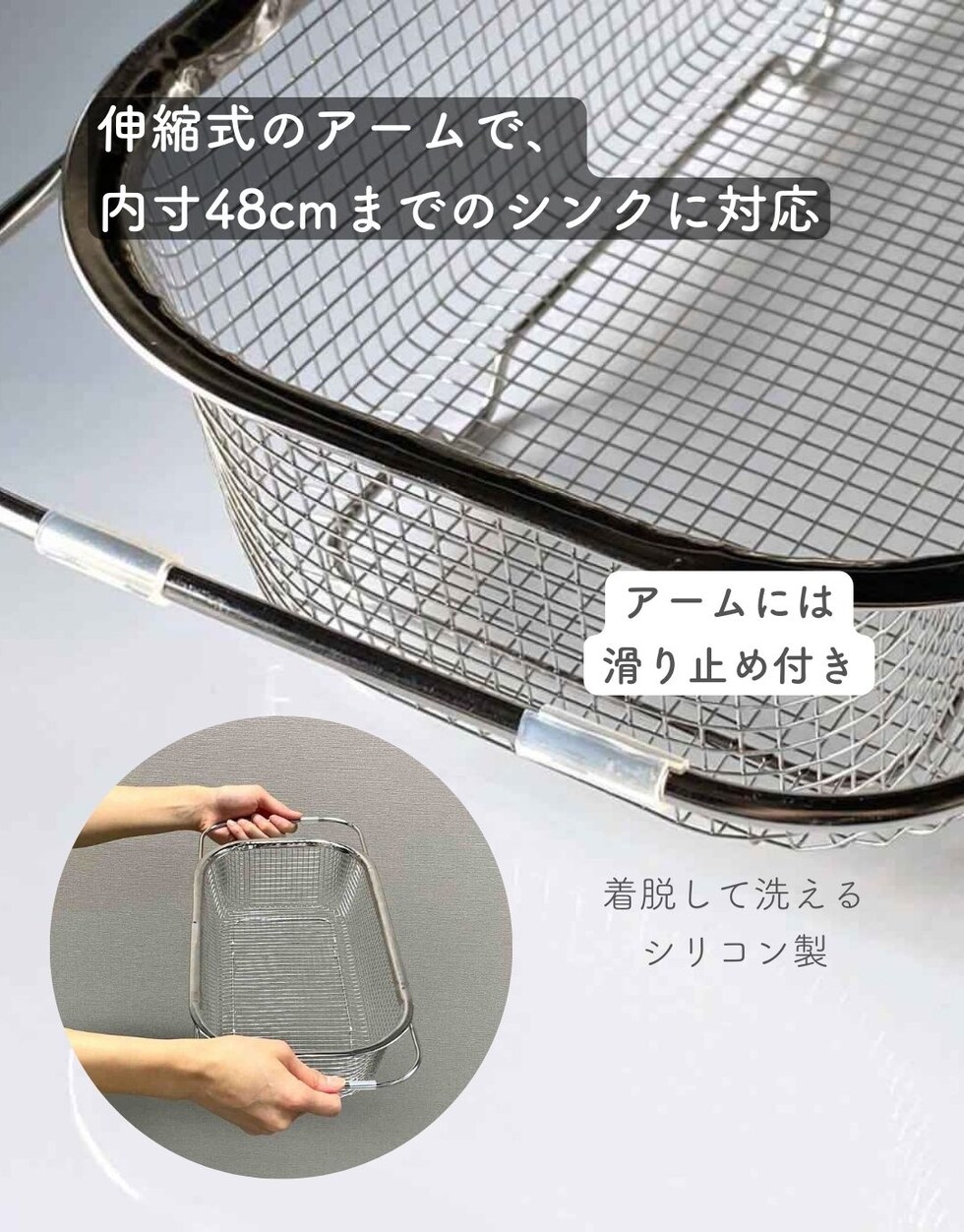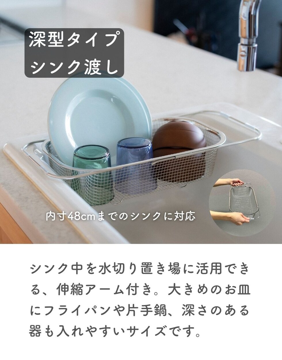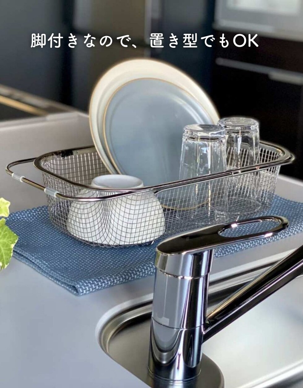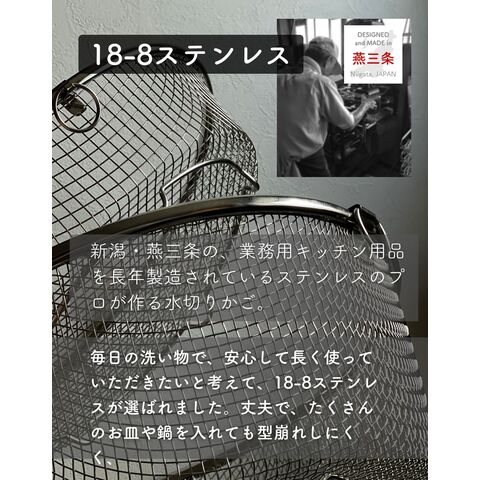 | 商品説明 | ●食洗機で丸洗いもできる、コンパクトな水切りカゴ ●暮らしのスタイルに合わせて使い分けできる、豊富なサイズ展開 ●食器を洗うときだけ取り出して使うことで、シンク周りを広く活用 ●食洗器で丸洗いもOK ●脚高なので、隙間をつくって水切り可能 ●使わないときはリングで吊り下げ収納でき、重ねて収納も可能 ●シンプルなデザインと、燕三条の技術が光る日本製の美しい仕上がりで滑らかな手触り●野菜などのザルとしても活躍 ● ▼深型・シンク渡し ●内寸48cmまでのシンクに合わせて、アームを伸縮して設置可能 ●シンク中のデッドスペースを有効活用して、キッチンの調理スペースを有効活用 ●深皿やボウル、大きい平皿なども入れやすい深型タイプ ●内寸: 幅30.5x奥行14.5x深さ8cm ●耐荷重:[底部]3kg、[アーム部]1kg ●対応サイズ: シンク内寸48cmまで対応 |
