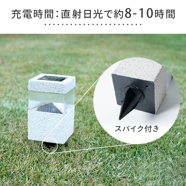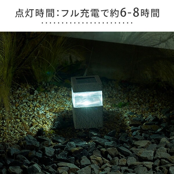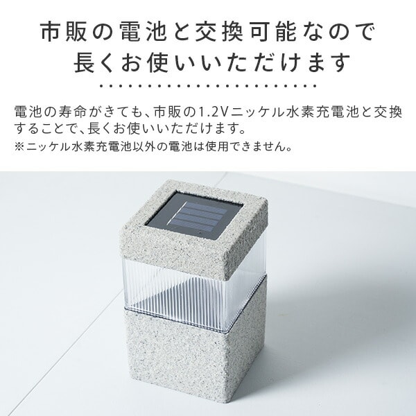 | 商品説明 | ●石の質感が自然な雰囲気を演出 ●地面に差し込むスパイク付き ●防塵防水性能:IP44 ※水没は不可 ●LED:0.1W相当 LED1灯 ●充電池:1.2V 単三形 600mAh ニッケル水素 1本 ●充電時間(目安):直射日光で約8-10時間 ●点灯時間(目安):フル充電で約6-8時間 ●充放電回数(目安):約500回 ※使用状況によって変化します ●市販の1.2Vニッケル水素充電池と交換可能なので電池の寿命が来ても交換することで長くお使いいただけます ●暗くなったら自動で点灯 ●電気代が不要なソーラーパネル ※スイッチをオンにした状態で十分に日光に当てて充電してから使用してください ※夜間になっても室内の光や電灯などで明るくなってしまう場所に設置した場合、光センサーが作動せず点灯しない場合がございます ※初期不良の場合の対応について ※複数個を同条件下で設置頂いた際に大きく点灯具合の異なる製品がある場合、交換対応させていただきます お手数ですが店舗窓口までご連絡をお願いいたします |