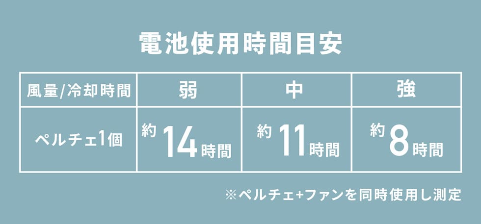 ●電池使用時間(運転時間):(弱)約14時間・(中)約11時間・(強)約8時間