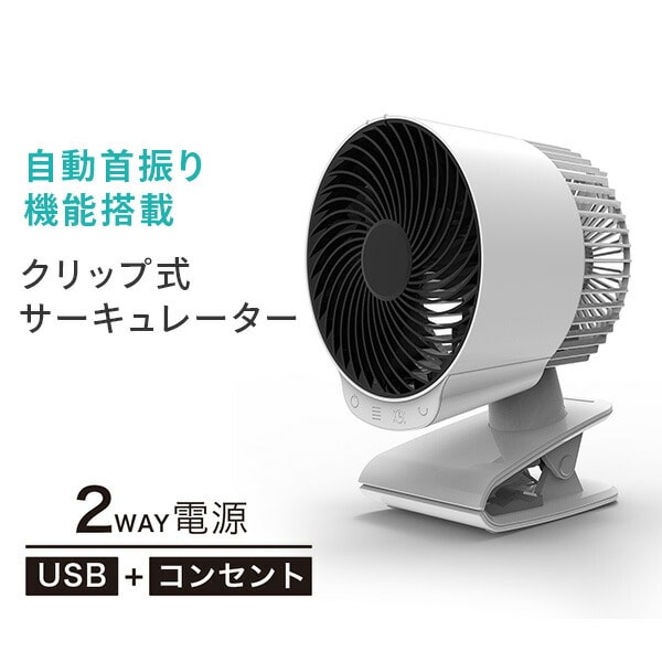 | 商品説明 | ●自動首振りクリップ式サーキュレーター ●2電源対応(コンセント、USB) ●風量4段階(弱・中・強・ターボ) ●DCモーター搭載 ●羽根径15cm ●角度調整(上手動 50°/左右自動 70°) ●付属品:専用ACアダプター、USB電源ケーブル、リモコン |