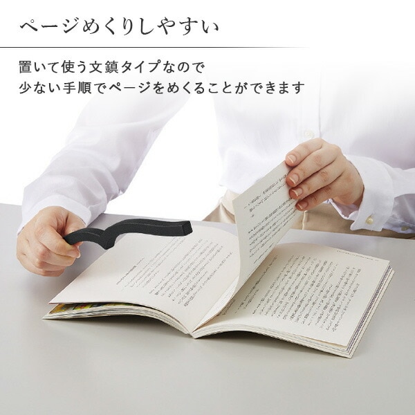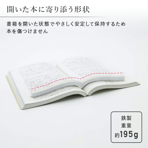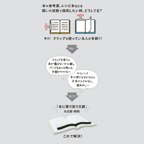 | 商品説明 | ●開いた本に寄り添う形状 ●少ない手順でページをめくることができる文鎮タイプ ●参考書を使って勉強する際やレシピ本を見ながら料理をする際など様々なシーンで活躍 |