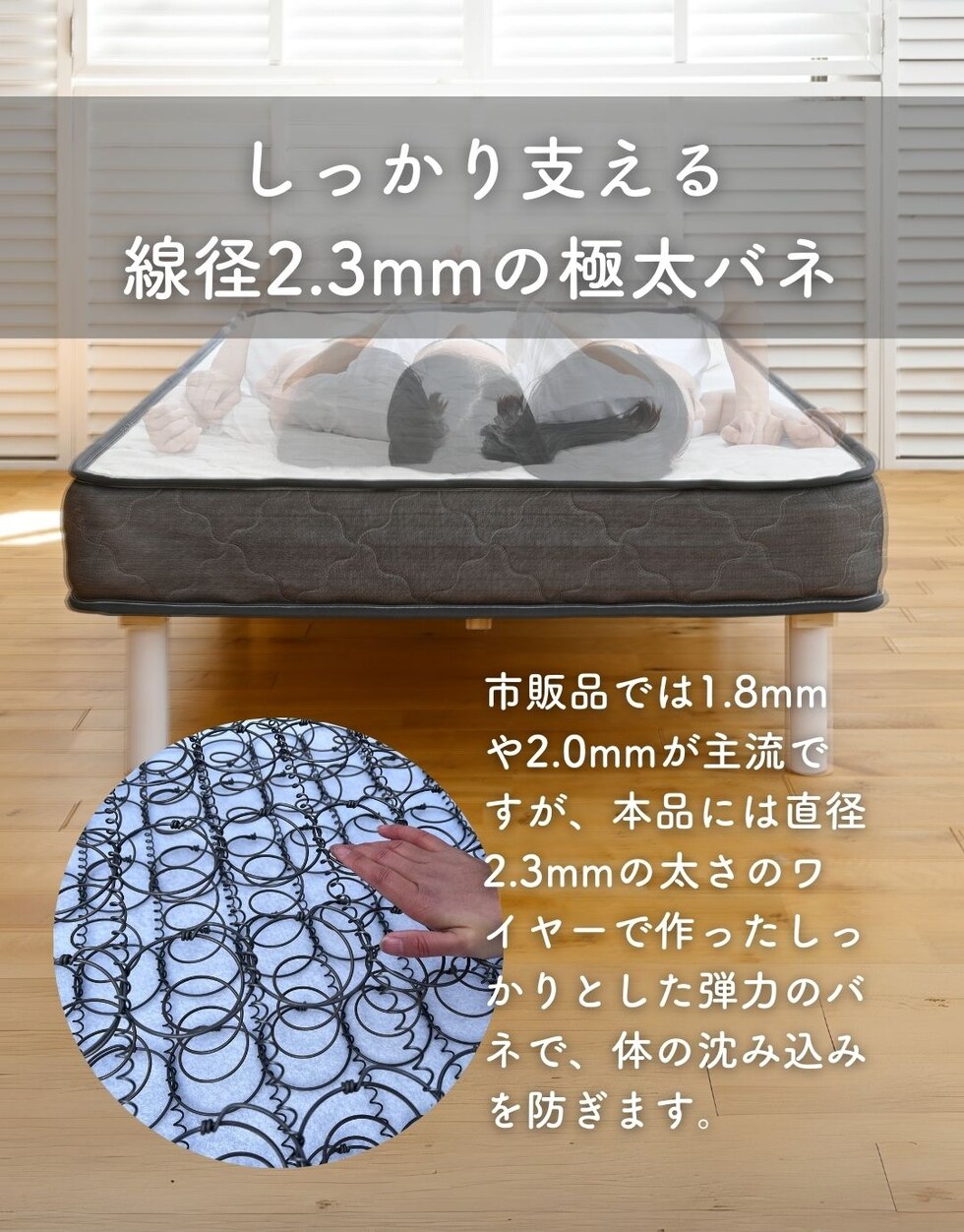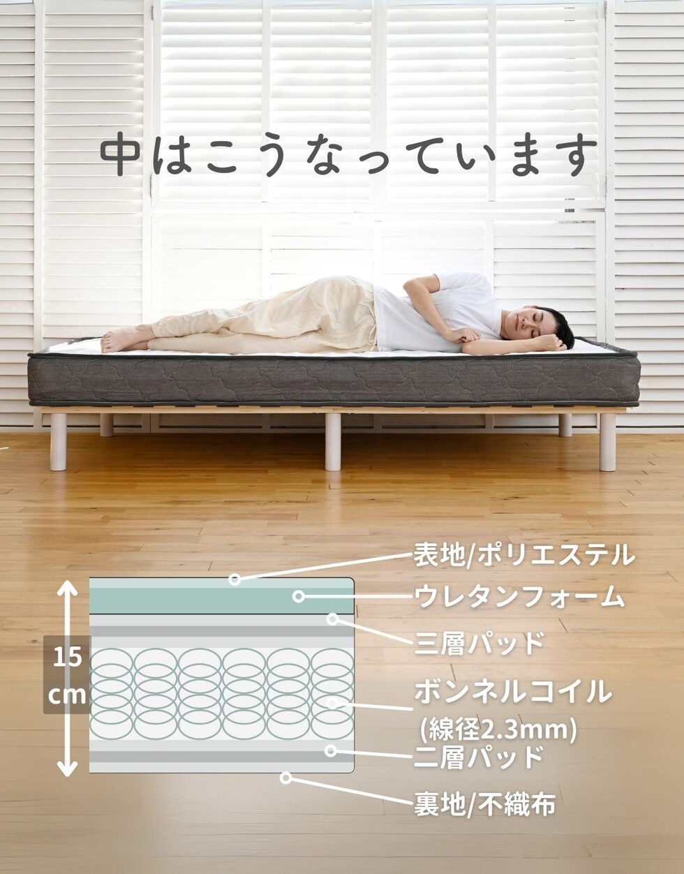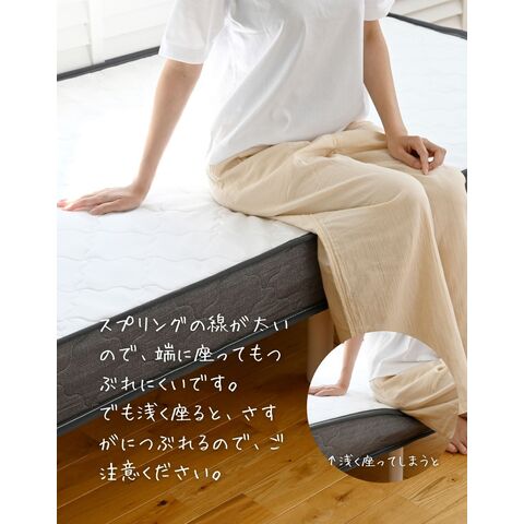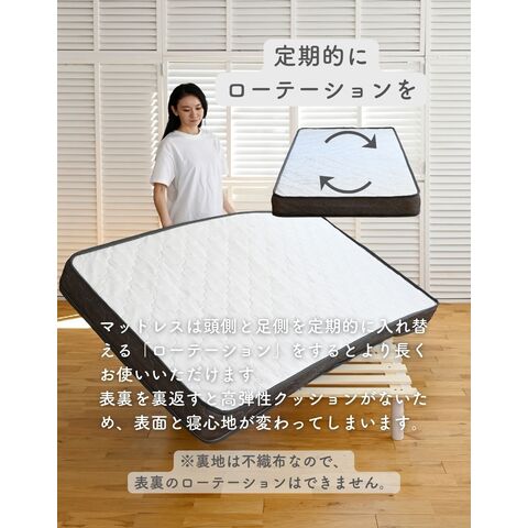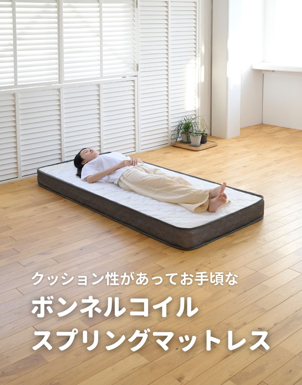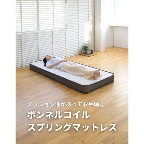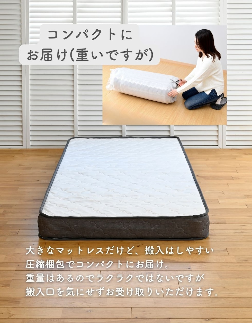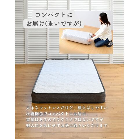 | 商品説明 | ●圧縮梱包で玄関先まで小さくお届けできるマットレス ※開封後約1日で復元しますが、環境により時間が前後します ●開梱にはハサミが必要 ●スプリングマットレスのエントリーモデル ●身体を面で支え、硬めの寝心地のボンネルコイルマットレス ●厚さ15cmのコンパクトなマットレス ●直径2.3mmの太さしっかりのボンネルコイルで全面をサポート ●圧縮ロール式で梱包は小さくお届け ●荷重の目安: S, SD, SSS=静止時90kg 、D=静止時180kg ●コイル数:261個 ※裏面は不織布のため、表裏のローテーションはできません。 |