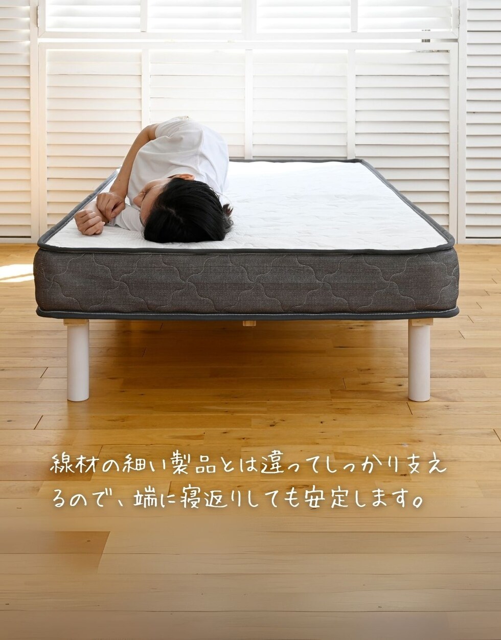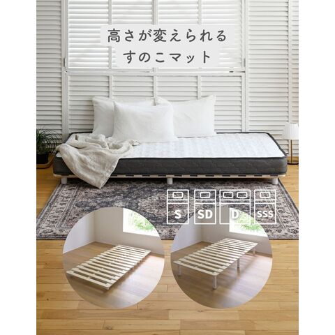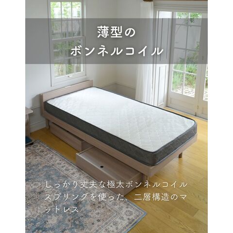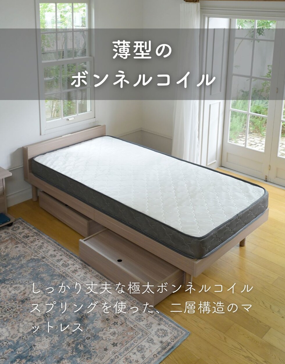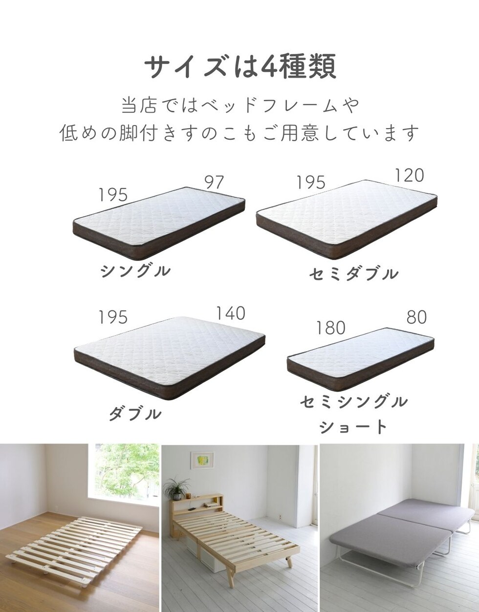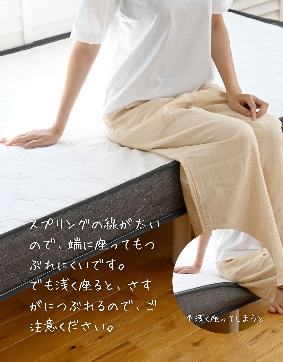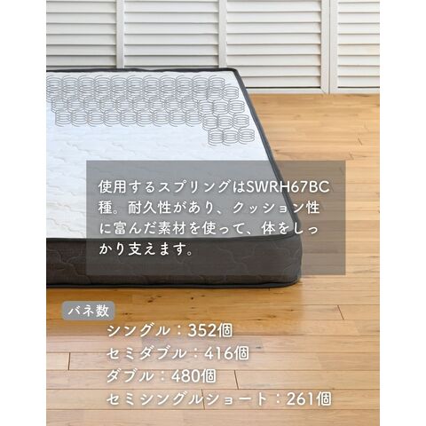 | 商品説明 | ●圧縮梱包で玄関先まで小さくお届けできるマットレス ※開封後約1日で復元しますが、環境により時間が前後します ●開梱にはハサミが必要 ●スプリングマットレスのエントリーモデル ●身体を面で支え、硬めの寝心地のボンネルコイルマットレス ●厚さ15cmのコンパクトなマットレス ●直径2.3mmの太さしっかりのボンネルコイルで全面をサポート ●圧縮ロール式で梱包は小さくお届け ●荷重の目安: S, SD, SSS=静止時90kg 、D=静止時180kg ●コイル数:261個 ※裏面は不織布のため、表裏のローテーションはできません。 |