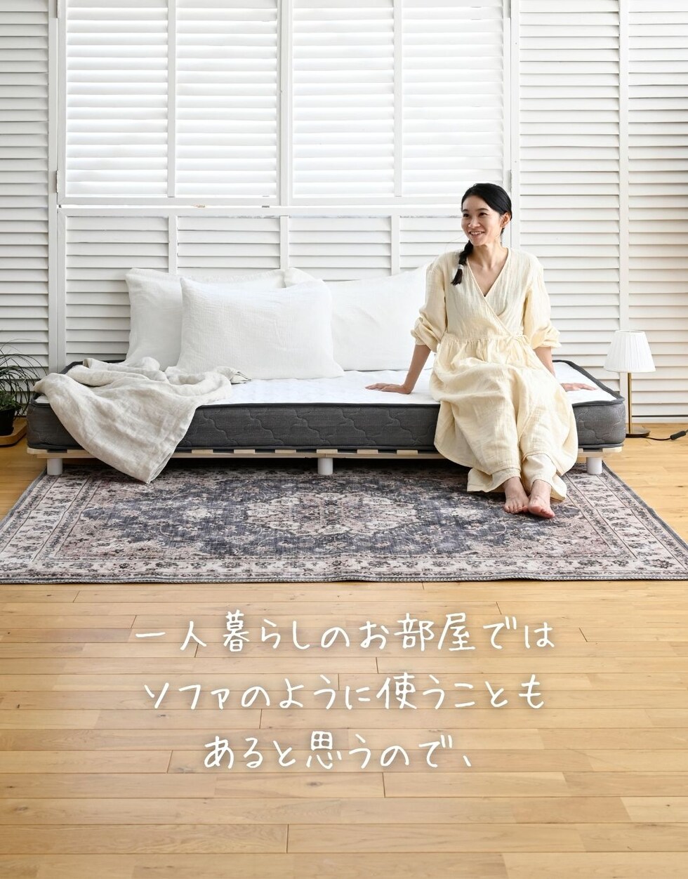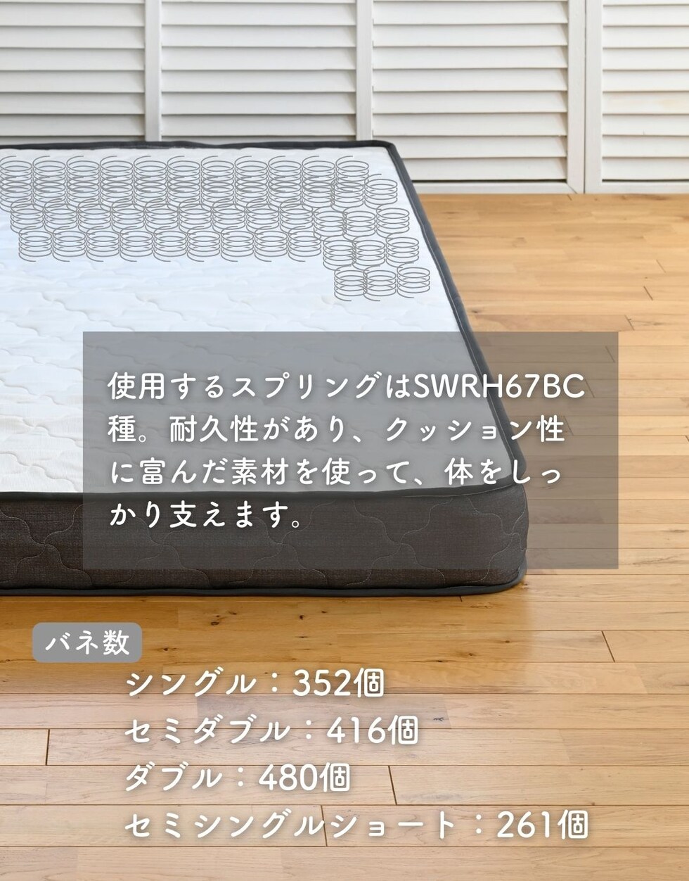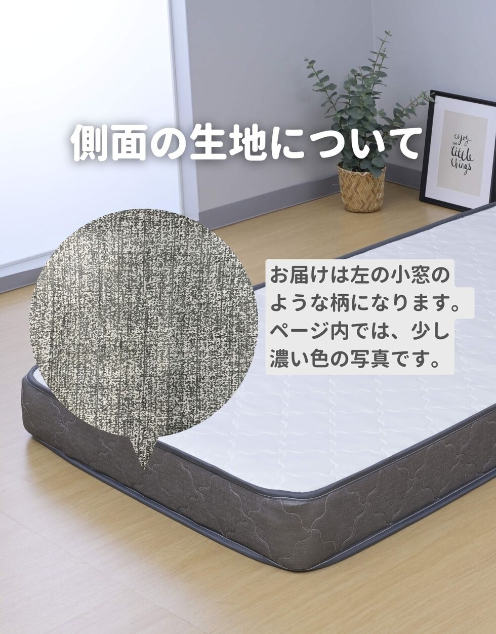 | 材質 | 表地: ポリエステル100% 中材: コイルスプリング、ウレタンフォーム、フェルト(ポリエステル) 裏地: 不織布 |