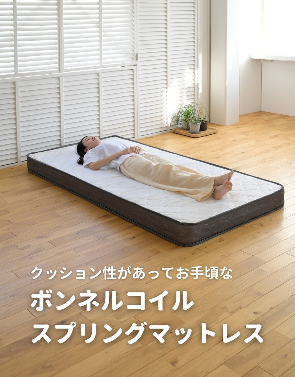 | 商品説明 | ●圧縮梱包で玄関先まで小さくお届けできるマットレス ※開封後約1日で復元しますが、環境により時間が前後します ●開梱にはハサミが必要 ●スプリングマットレスのエントリーモデル ●身体を面で支え、硬めの寝心地のボンネルコイルマットレス ●厚さ15cmのコンパクトなマットレス ●直径2.3mmの太さしっかりのボンネルコイルで全面をサポート ●圧縮ロール式で梱包は小さくお届け ●荷重の目安: S, SD, SSS=静止時90kg 、D=静止時180kg ●コイル数:S/352個 ※裏面は不織布のため、表裏のローテーションはできません。 |