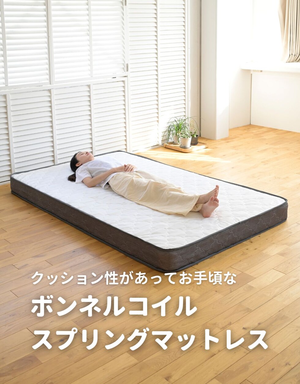 | 商品説明 | ●圧縮梱包で玄関先まで小さくお届けできるマットレス ※開封後約1日で復元しますが、環境により時間が前後します ●開梱にはハサミが必要 ●スプリングマットレスのエントリーモデル ●身体を面で支え、硬めの寝心地のボンネルコイルマットレス ●厚さ15cmのコンパクトなマットレス ●直径2.3mmの太さしっかりのボンネルコイルで全面をサポート ●圧縮ロール式で梱包は小さくお届け ●荷重の目安: S, SD, SSS=静止時90kg 、D=静止時180kg ●コイル数:416個 ※裏面は不織布のため、表裏のローテーションはできません。 |