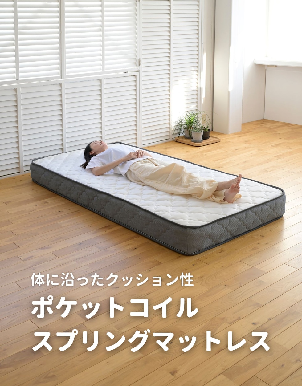 | 商品説明 | ●圧縮梱包で玄関先まで小さくお届けできるマットレス ※開封後約1日で復元しますが、環境により時間が前後します ●開梱にはハサミが必要 ●身体に沿って沈み込む、ポケットコイルマットレス ●厚さ20cmマットレス ●床面は直径1.8mmの太さポケットコイルで、身体に沿うクッショニング ●周囲は直径2.3mmの太さしっかりのコイルで沈み込みを防ぐ、エッジサポート仕様 ●側面は通気の良いメッシュ生地 ●圧縮ロール式で梱包は小さくお届け ●荷重の目安: S, SD, SSS=静止時90kg 、D=静止時180kg ●コイル数:S/528個 ※裏面は不織布のため、表裏のローテーションはできません。 |
