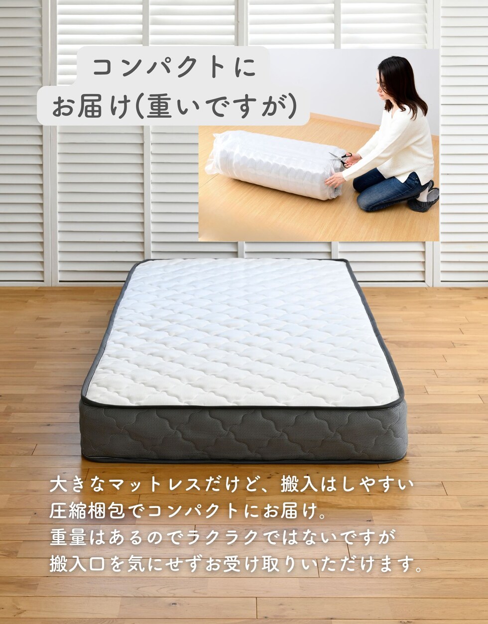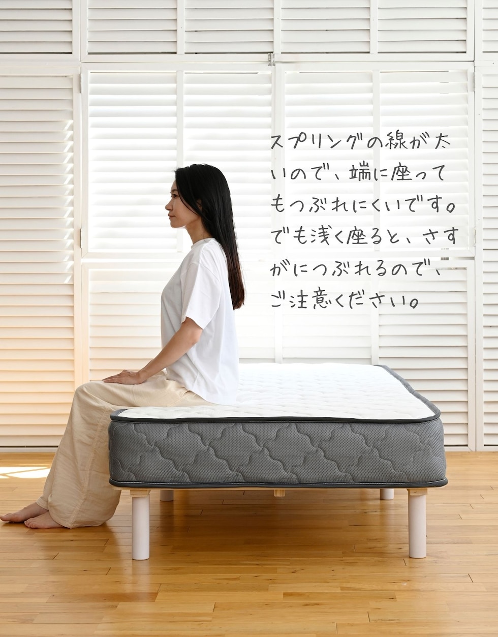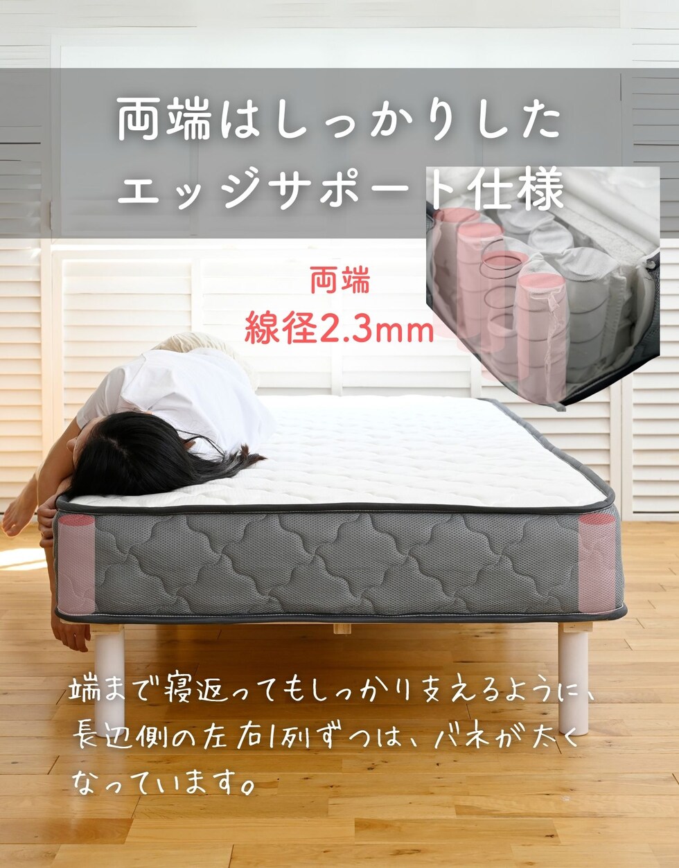 | 商品説明 | ●圧縮梱包で玄関先まで小さくお届けできるマットレス ※開封後約1日で復元しますが、環境により時間が前後します ●開梱にはハサミが必要 ●身体に沿って沈み込む、ポケットコイルマットレス ●厚さ20cmマットレス ●床面は直径1.8mmの太さポケットコイルで、身体に沿うクッショニング ●周囲は直径2.3mmの太さしっかりのコイルで沈み込みを防ぐ、エッジサポート仕様 ●側面は通気の良いメッシュ生地 ●圧縮ロール式で梱包は小さくお届け ●荷重の目安: S, SD, SSS=静止時90kg 、D=静止時180kg ●コイル数:726個 ※裏面は不織布のため、表裏のローテーションはできません。 |