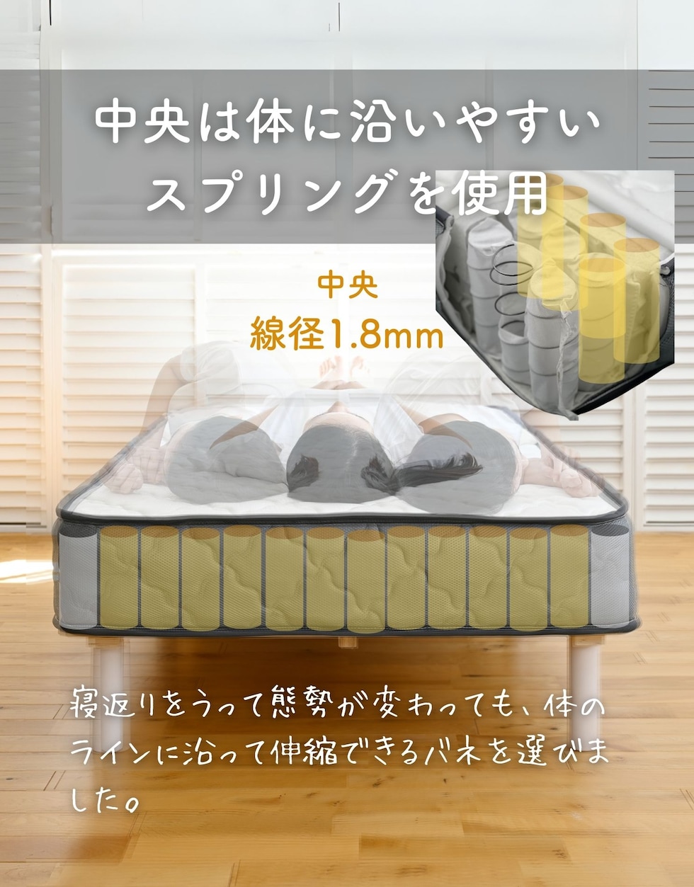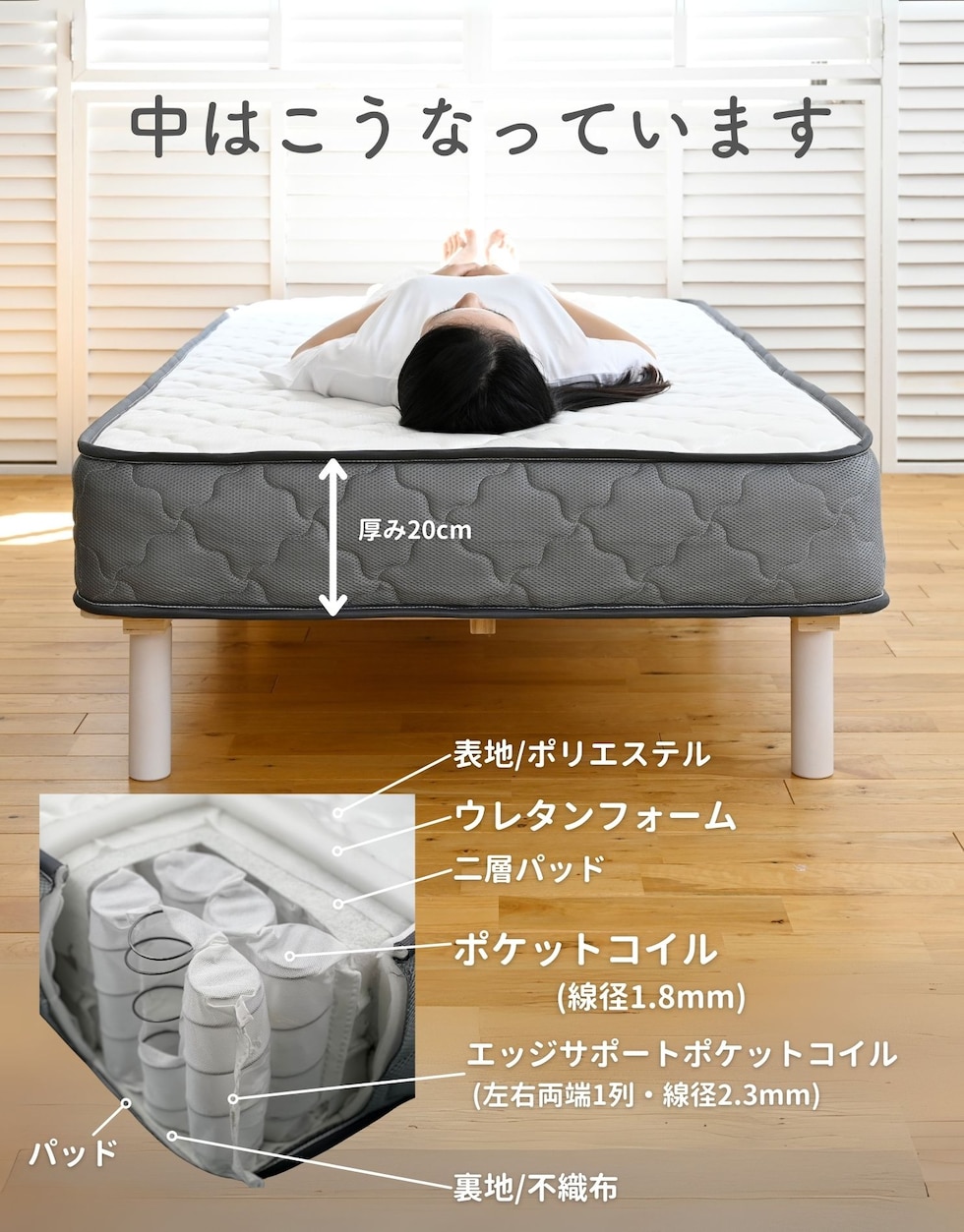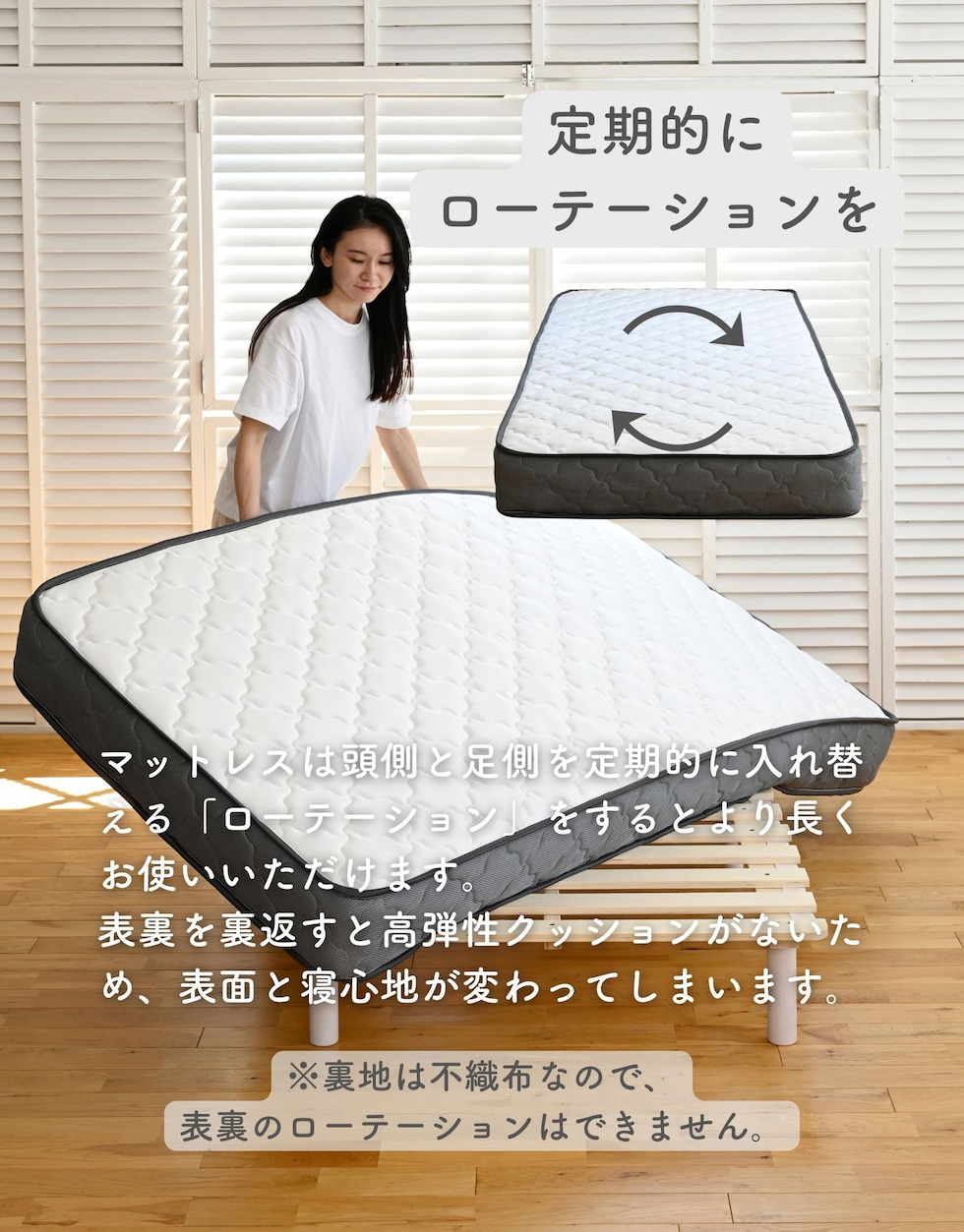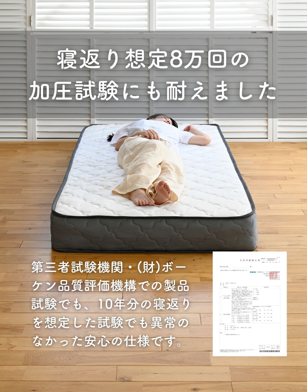 | 商品説明 | ●圧縮梱包で玄関先まで小さくお届けできるマットレス ※開封後約1日で復元しますが、環境により時間が前後します ●開梱にはハサミが必要 ●身体に沿って沈み込む、ポケットコイルマットレス ●厚さ20cmマットレス ●床面は直径1.8mmの太さポケットコイルで、身体に沿うクッショニング ●周囲は直径2.3mmの太さしっかりのコイルで沈み込みを防ぐ、エッジサポート仕様 ●側面は通気の良いメッシュ生地 ●圧縮ロール式で梱包は小さくお届け ●荷重の目安: S, SD, SSS=静止時90kg 、D=静止時180kg ●コイル数:726個 ※裏面は不織布のため、表裏のローテーションはできません。 |