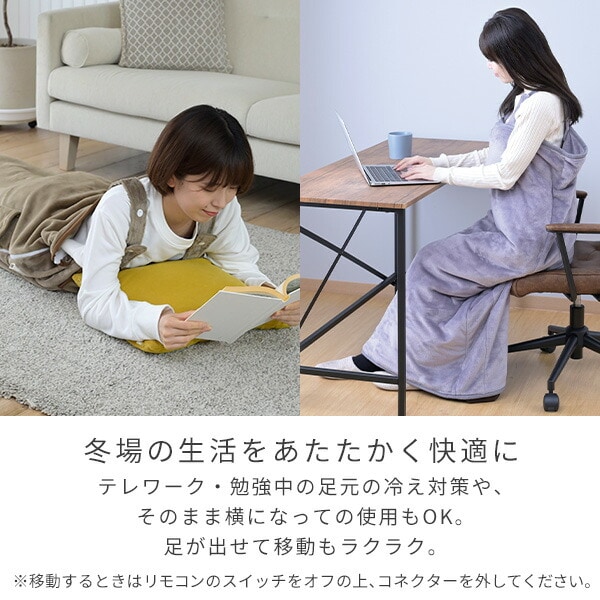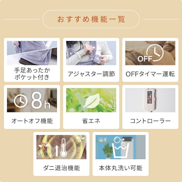 | 商品説明 | ●消費電力:40W ●表面温度:(弱)約23度、(適温)約33度、(強)約53度 ●電気代目安(1時間あたり):(弱)約0.4円、(適温)約0.6円、(強)約0.8円 ※電気料金目安単価31円/kWhを基に算出 ●電源コード長さ:(電源側)1.96m、(本体側)0.65m ●2時間オフタイマー/8時間自動オフ ●肩ヒモ調節可能(身長目安150-180cm) ●ダニ対策機能 ●本体丸洗い可能 ※コントローラーは洗えません ●メーカー保証1年付き |