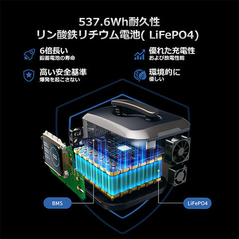 | 商品説明 | ●充電池タイプ:リン酸鉄リチウムイオン充電池 ●充電池容量:537.6Wh (168000mAh/3.2V) ●液晶画面/残量表示:4インチLCDカラースクリーン/パーセンテージ表示 ●最大9台の機器に同時給電が可能 ・AC出力はコンセントを2口搭載。合計500W(瞬間最大1000W) ・USB-A(急速充電対応)を2口(2×18W 合計最大36W)、USB-C(PD)を2口(2×60W 合計最大120W) ・シガーソケットを1口(最大120W)、DCポートを2口(2×30W 合計60W)搭載し幅広く機種への充電に対応可能 ※9口が同時に使用される場合の合計最大出力は500Wとなり、瞬時最大1000Wとなります ●LEDライト搭載(3つの照明モード 強-中-SOS 搭載) ●2時間で約80%充電(3時間でフル充電) ●充電方法:ACアダプター、ソーラーパネル、シガーソケット、USB-C ●24カ月メーカー保証 ●セット内容:ポータブル電源本体、シガープラグ→DC5525ケーブル、ACアダプターと電源ケーブル、USB-Cケーブル、取扱説明書 |