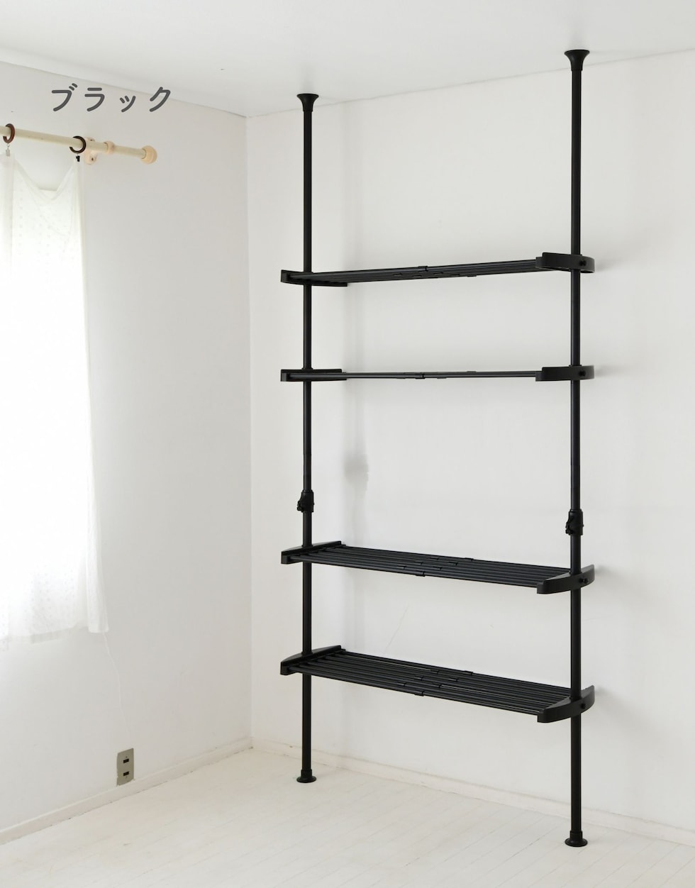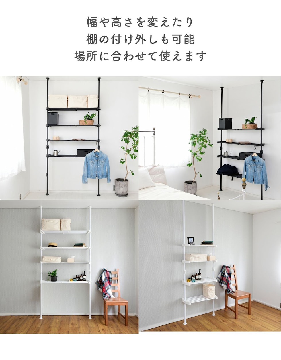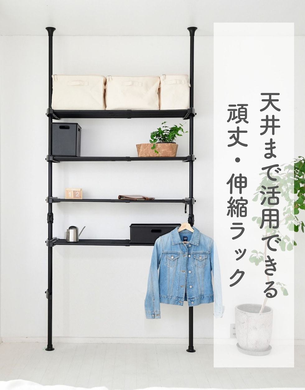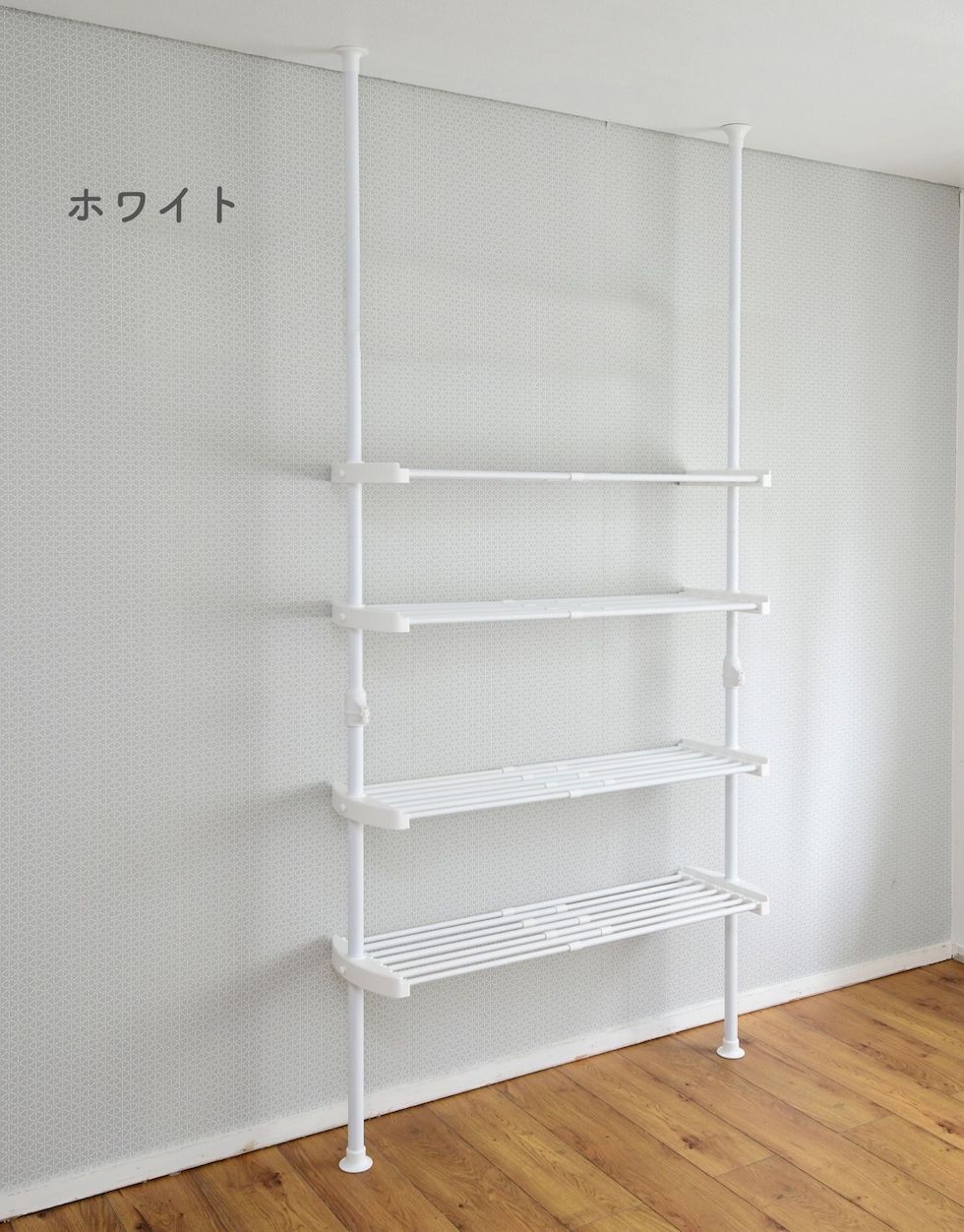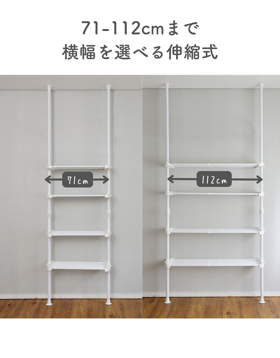 | 商品説明 | ※ポールに目安となるステッカーを貼っています。ステッカー位置までしっかり突っ張って下さい。 ※畳などの柔らかい床面や強度の弱い天井へは設置ができません。 ※勾配天井は対応できません。 ●天井までを活用できる、スチールパイプの4段ラック ●幅71cmから112cmまで、横幅サイズを選べる伸縮式 ●工事不要、設置もかんたんな突っ張り固定式 ●棚板耐荷重15kgのしっかり構造 ●支柱は左右個別に伸縮可能、梁や床の高さにも対応可能 ●しっかり取り付き、ずれにくいスプリング圧縮式 ●天井・床の接地部にはエラストマー素材のすべり止め付き ●棚の高さは、工具不要でかんたんに調節可能 ●棚内寸:幅61-102 奥行30cm ●下段2つの棚はアダプタ利用で上段へ切り替え可能 ●耐荷重: 棚板1枚当たり15kg ●全体耐荷重: 60kg ●支柱を組み替えることで、200-280cmと高さ140-188cmの2段に高さを設定可能 ※2024年10月7日より4段タイプとなりました。 |