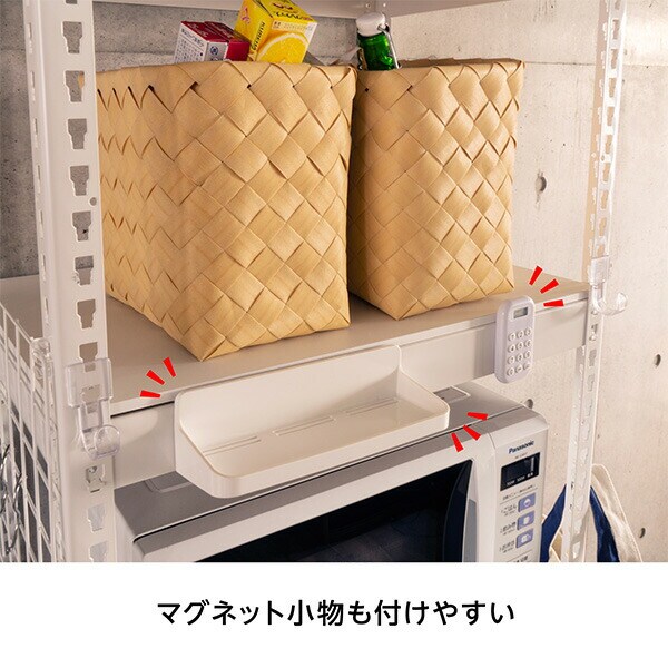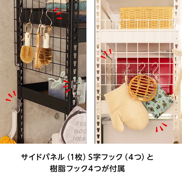 | 商品説明 | ●ペール上の空間や冷蔵庫の上、洗面所収納にも使えるマルチなラック ●モノトーンのフレームと木目調棚板の異素材をミックスしたオープンラック ●棚板は木目調のリバーシブル仕様で、ダークブラウン・ナチュラルの2色を選択可能 ●耐荷重が棚板1枚当たり50kgと高耐荷重設計 ●ブラケットの反転設置で、フラットにもこぼれ止め用にも使い分けできるボード ●サイドパネル1枚、S字フック4つ、樹脂フックが4つ付属 ●同じシリーズを連結してもご利用可能 ●ネジ締め不要、組み立てはかんたんで、差し込んで付属のハンマーではめ込むシンプルな方法を採用 ●耐荷重: 棚1段あたり50kg、全体150kg ●棚板は3cm間隔で設置可能 ●組立用専用ゴムハンマー付き |