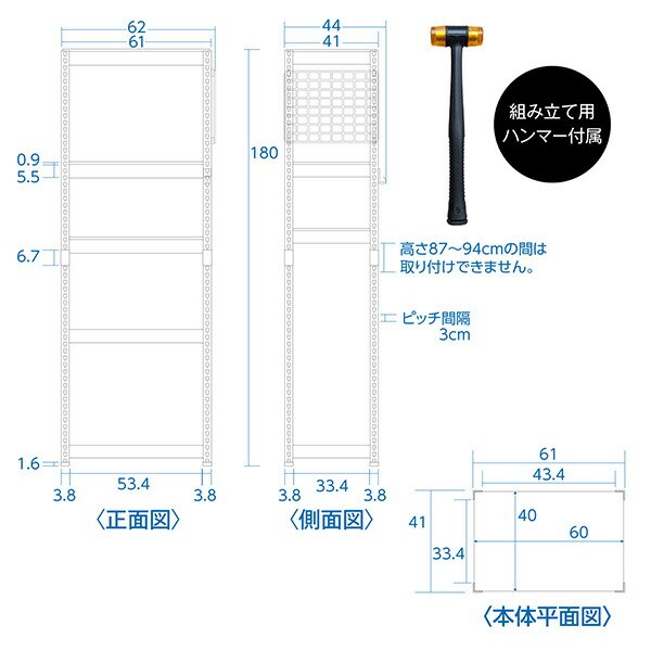 | 本体サイズ | 幅62×奥行44×高さ180cm 重量14kg |