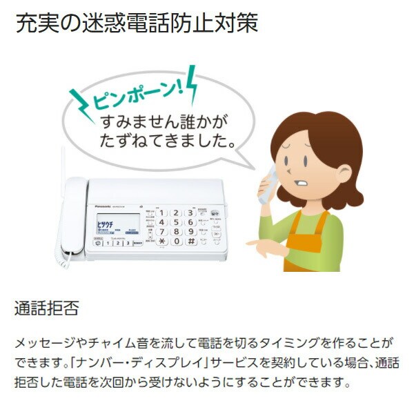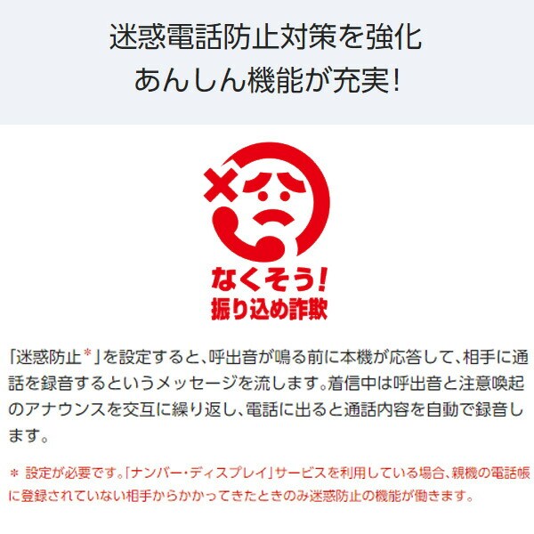 YAMAZEN ヤマゼン 山善 通販 パナソニック Panasonic コードレス電話機 固定電話 留守番電話機 電話帳 振り込め詐欺 オレオレ詐欺 給付金詐欺 撃退 着信拒否 子機 録音 自動録音 セールス 安心 保留 非通知 内線 フリーダイヤル ナンバーディスプレイ 敬老の日 老人 見守り 白 簡単 おすすめ 見やすい 大文字 大画面 高齢者向け 特殊詐欺防止 電話機 音声案内 防犯対策 受話器 通話 録音 ファックス ファクス ファクシミリ FAX 一人暮らし S4O01 |