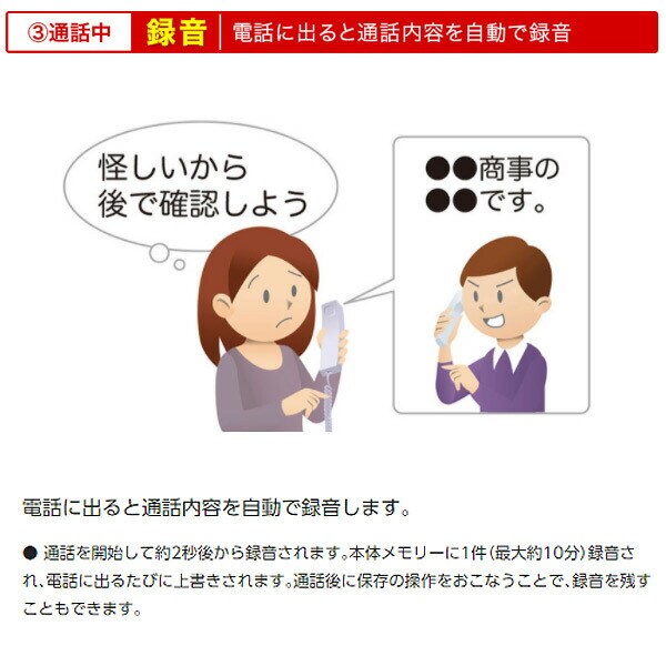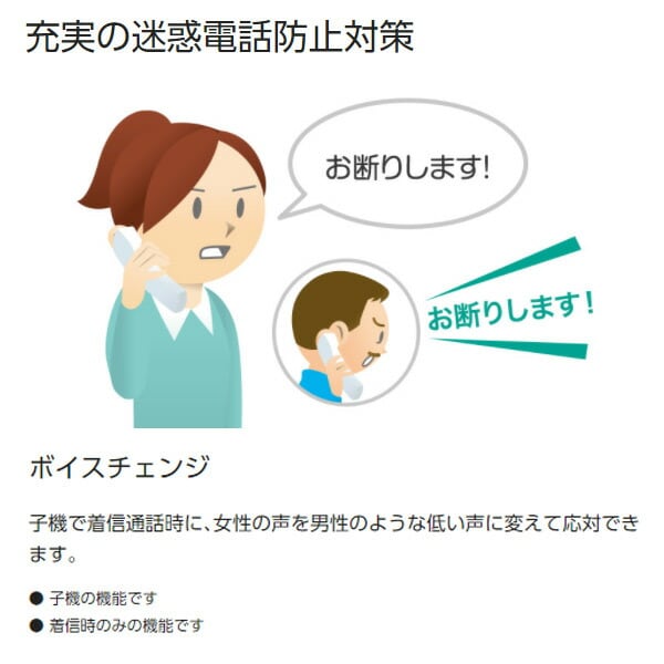 | 商品説明 | ●親機消費電力(最大/待機時):120W/0.5W ●充電台消費電力(最大/待機時):0.7W/0.2W ●呼出音が鳴る前に相手に警告メッセージを流す、「迷惑防止」機能搭載 ●通話内容を最大約10分自動で録音 ●300件まで登録可能な迷惑電話着信拒否 ●相手を確認してから電話に出られる「あんしん応答」 ●ナンバー・ディスプレイ契約なしでも不在着信履歴を表示(日付・時刻のみ) ●よく掛ける番号を登録できるワンタッチダイヤル3件 ●付属品:受話器、受話器コード、お試し用インクフィルム(約5m)、コードレス子機、子機用電池パック、子機用電池カバー、子機充電台 |