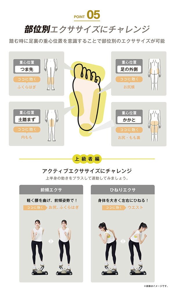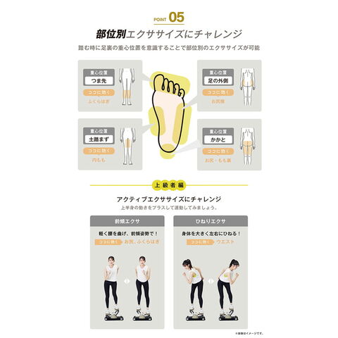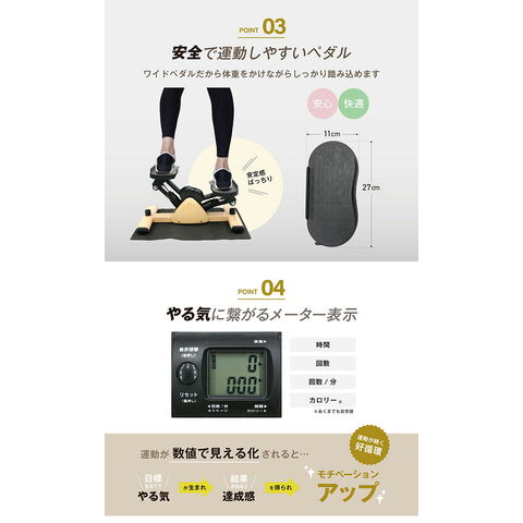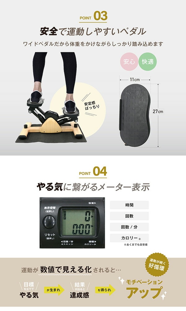 | 商品説明 | ●気になるお尻周りをすっきりシェイプアップ ●左右に踏み込むため、内ももやお尻・体幹など普段使わないような幅広い筋肉をバランスよく使いながら運動できます ●大きく運動しやすいワイドペダル ●油圧シリンダーでスムーズな駆動を実現 ●使用制限体重:100kg ●連続使用時間:20分 ●電源:単四乾電池×1本 ●付属品:保護マット |
