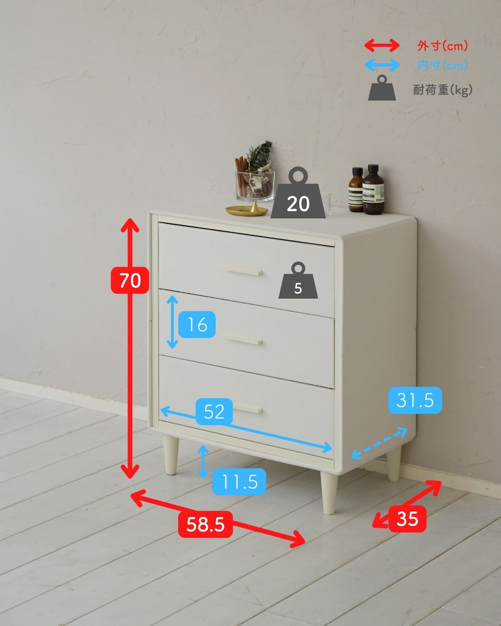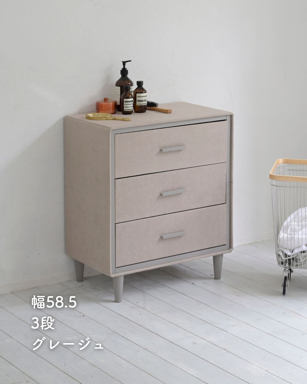 | 商品説明 | ●工具不要(プラスドライバー付き六角レンチ付属) ※お届け時、部材のにおいがこもっています。換気のために開封後すぐにご利用頂けない場合がございます。 ※本品の側地は撥水加工が施されておりますが、摩擦などの影響で経年で薄れます。必要に応じて、市販の防水スプレーも併用ください。 ●凹凸のない、壁に覆われたファブリックチェスト ●奥行35cmのスリムな引き出し収納 ●ロボット掃除機も入って掃除もしやすい高床式 ●枠組みでしっかりしたつくり; 枠組みをネジで固定して、カバーと脚を取り付けて完成 ●撥水効果のある生地を採用 ●引出し部分は内側不織布仕様で、衣類やタオルなどを優しく収納 ●引出しはストッパーなし ●引き出し幅は約19cm ●床からの隙間:11.5cm ●脚部には傷防止用フェルト付属 ●耐荷重:天板20kg、引き出し(大)5kg ●引き出し(大)内寸:幅52 奥行31.5 深さ16cm |
