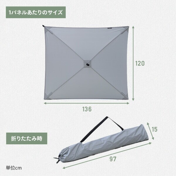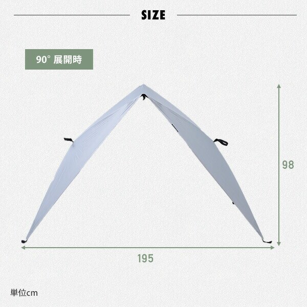 | 商品説明 | ●傘みたいに広げるだけ!簡単設置 ●タープの日除け面積拡大に ●付属品:ガイドロープ×3本、ペグ×6本 ●コンパクトに収納可能 ●UVカット加工された生地を使用。真夏の強い紫外線からしっかり守ります。 ●UV遮蔽率:94.2% ●UPFの最高値であるUPF 50+ 試験データあり |