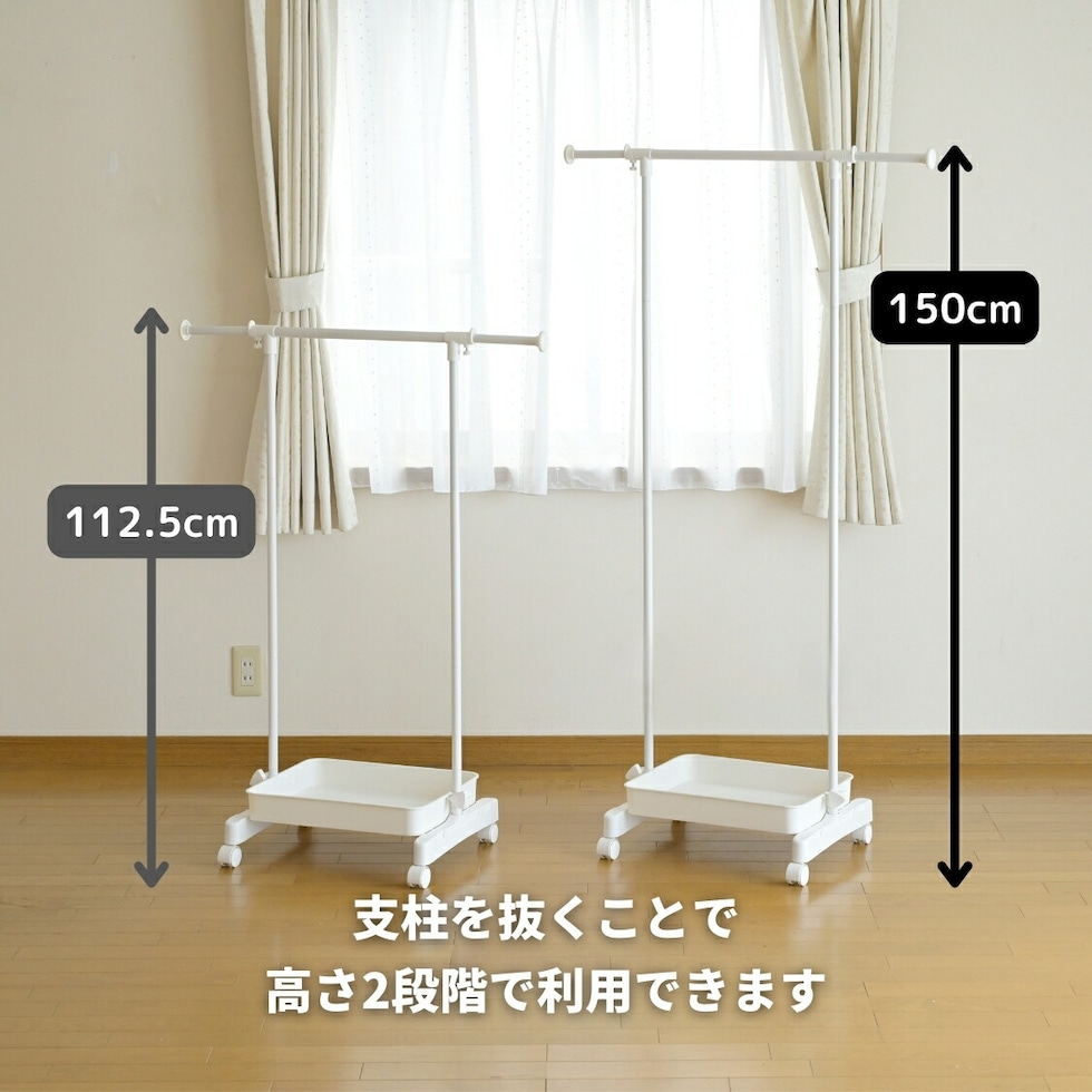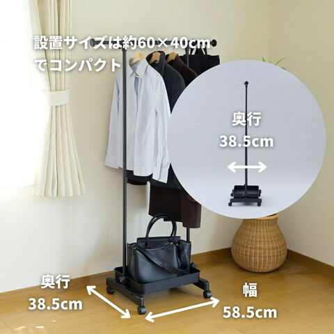 | 商品説明 | ●工具不要(素手のみで組み立て可能) ●シンプルなハンガーラック ●ハンガーバーの下にカゴが付いて、鞄や小物をひとまとめに収納可能 ●カゴの高さは自由に設定可能 ●支柱の中段パイプを抜くと、高さ112.5cmと低めにも変身 ●伸縮するサイドバーはチョイ掛けに便利 ●設置サイズは約60×40cmでコンパクト ●掃除や模様替えのときも移動がラクなキャスター付き(ストッパーなし) ●耐荷重: ハンガーバー10kg、伸縮サイドバー2kg×2か所、カゴ7kg ●カゴ内寸: 幅38.5 奥行30 深さ5.5cm |