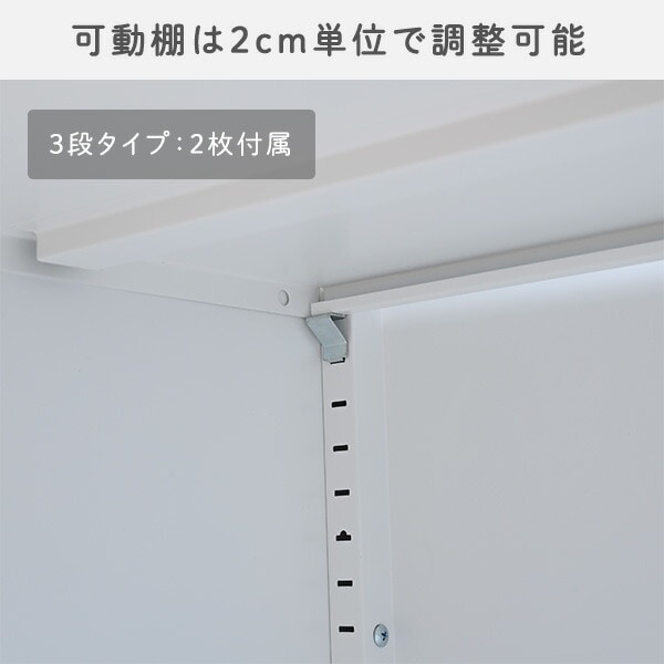 | 商品説明 | ●可動棚枚数:2枚 ●可動棚は2cm単位で調整可能 ●棚板1枚あたりの静止荷重:約30kg ●天板静止荷重:約20kg ●設置場所に応じてアジャスター調整可能 ●コンセント通し穴:1個 ●鍵付き(鍵2本) ●転倒防止金具付き ●横連結可能:同シリーズ(CSC-OP3、CSC-DD3、CSC-SL3、CSC-OP5、CSC-DD5、CSC-SL5)での横並び連結が可能 ※上下に連結はできません |