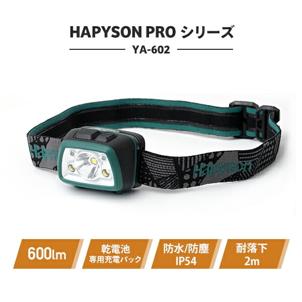 HAPYSON PROシリーズ 充電池 乾電池 どちらも使える LEDヘッドランプ 600ml 防水 防塵 IP54 2段階明るさ切替 YA-602 ヘッドライト LEDヘッドライト 登山 アウトドア キャンプ 釣り 防災用品 防災グッズ 停電 Hapyson ハピソン 【送料無料】